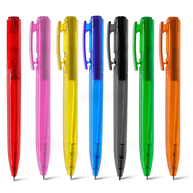 Caneta personalizada produzida em plástico translucido colorido. Possui acionamento através da ponteira superior e bloqueia com o Clip. Ideal para brindes promocionais, campanhas e eventos corporativos.