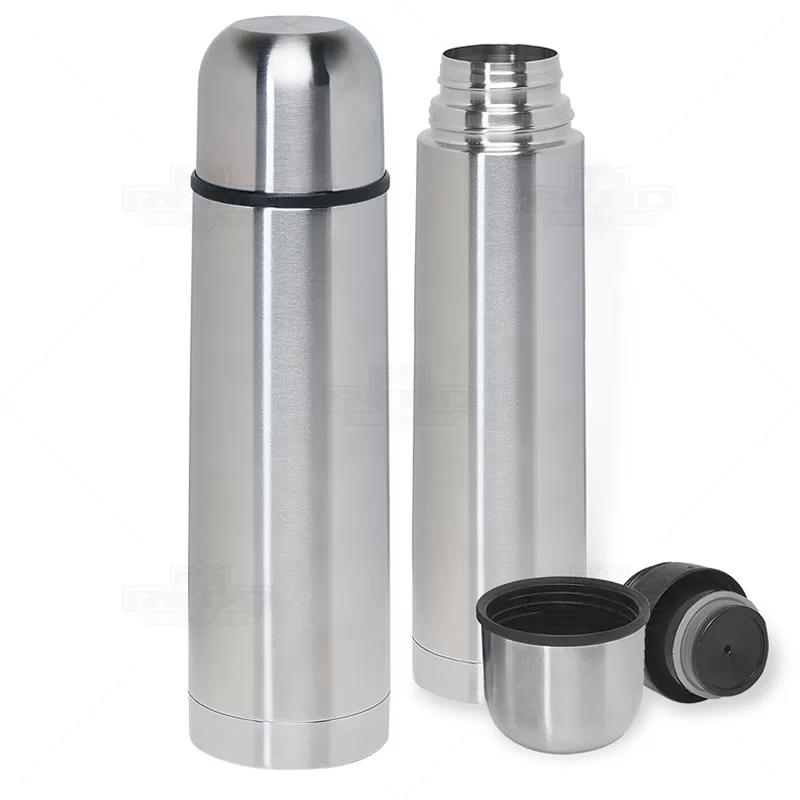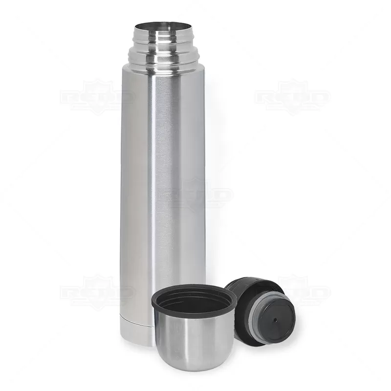 Garrafa térmica em inox com isolamento a vácuo e capacidade 1 litro. Conserva quente ou frio.