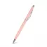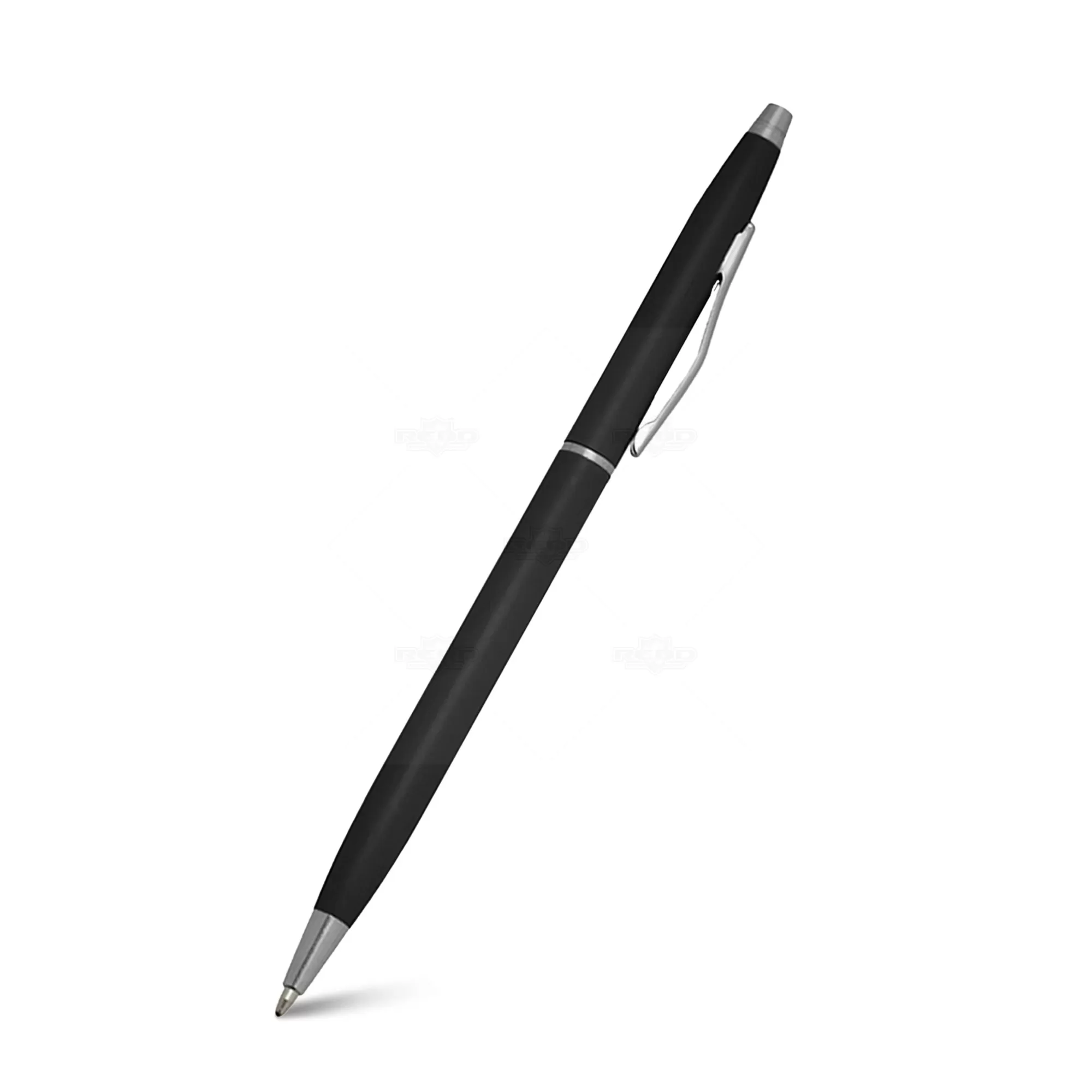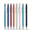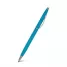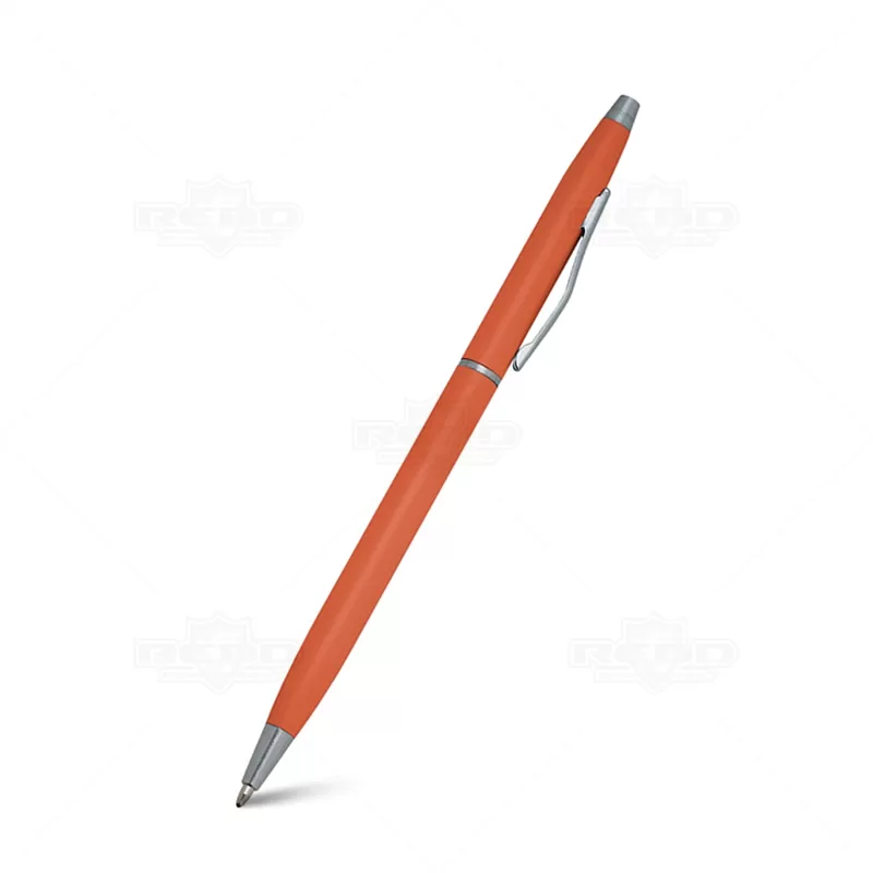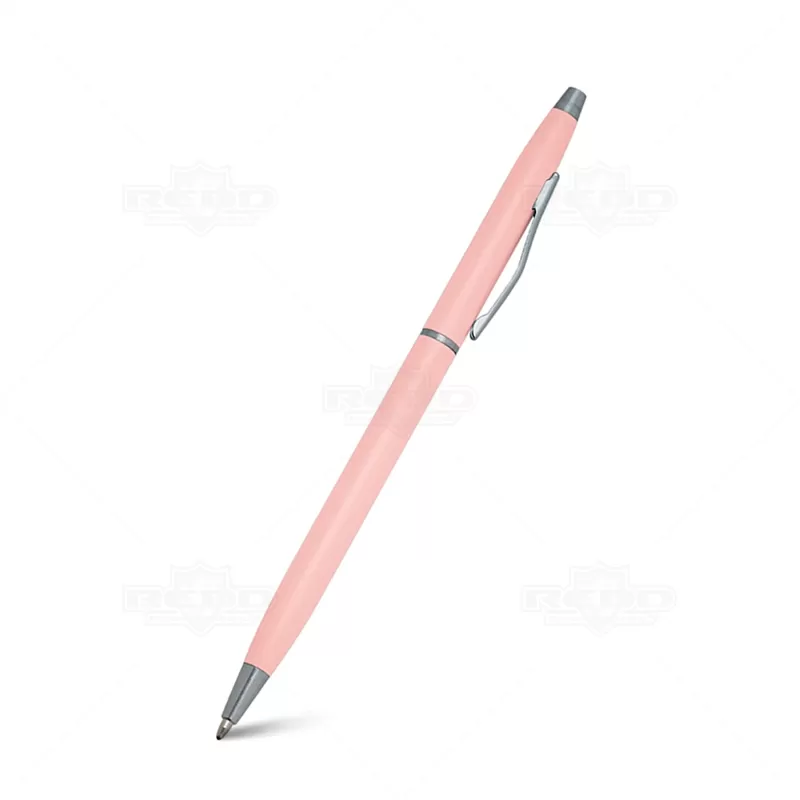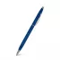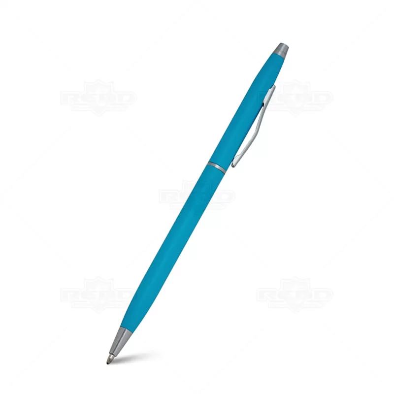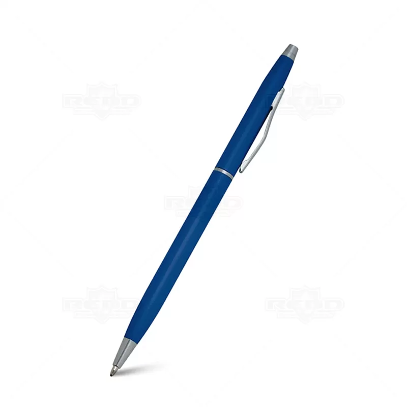 Caneta de metal personalizada com detalhes em metal, possui acionamento por giro, clip curvado de metal e esferográfica na cor azul. Ideal para brindes promocionais e eventos corporativos.