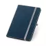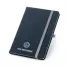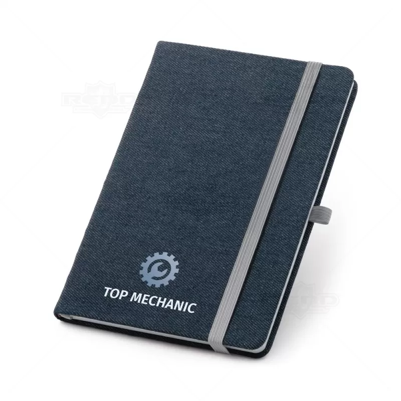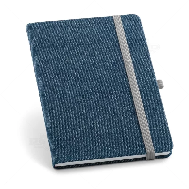 Bloco de anotações personalizado formato A5 com capa rígida em tecido tipo jeans. Contém aproximadamente 192 páginas pautadas brancas e suporte para caneta esferográfica (não incluída). Ideal para brindes promocionais e eventos corporativos.