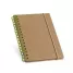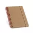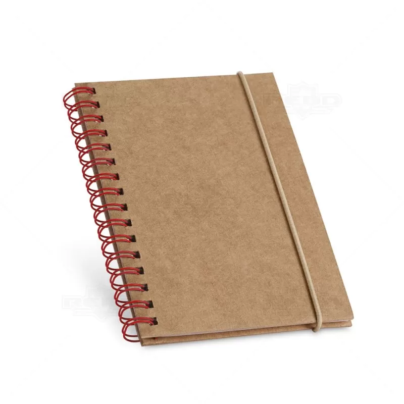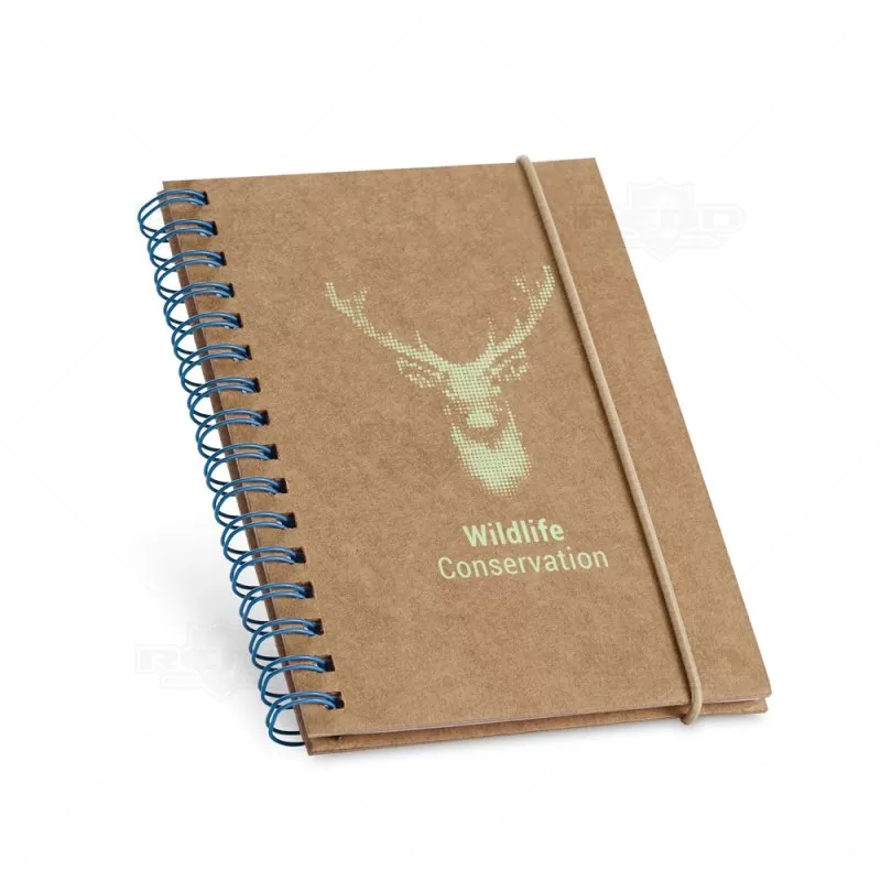 Bloco de anotações personalizado, com capa rígida em material reciclado. Contém aproximadamente 120 páginas pautadas de papel reciclado, elástico para fechamento e encadernação wire-o. Ideal para brindes promocionais e eventos corporativos.