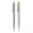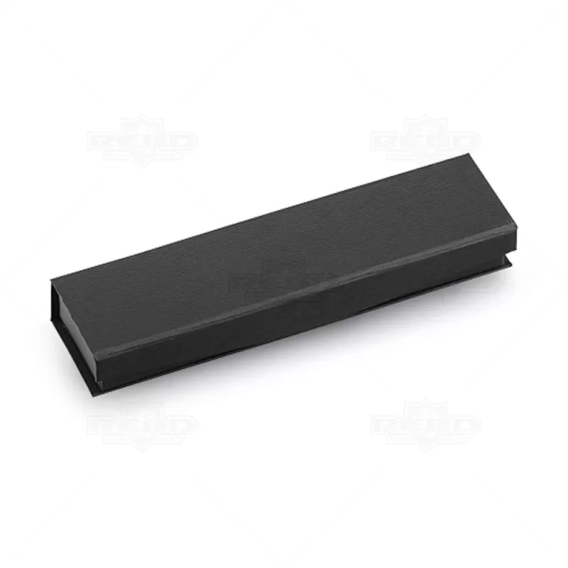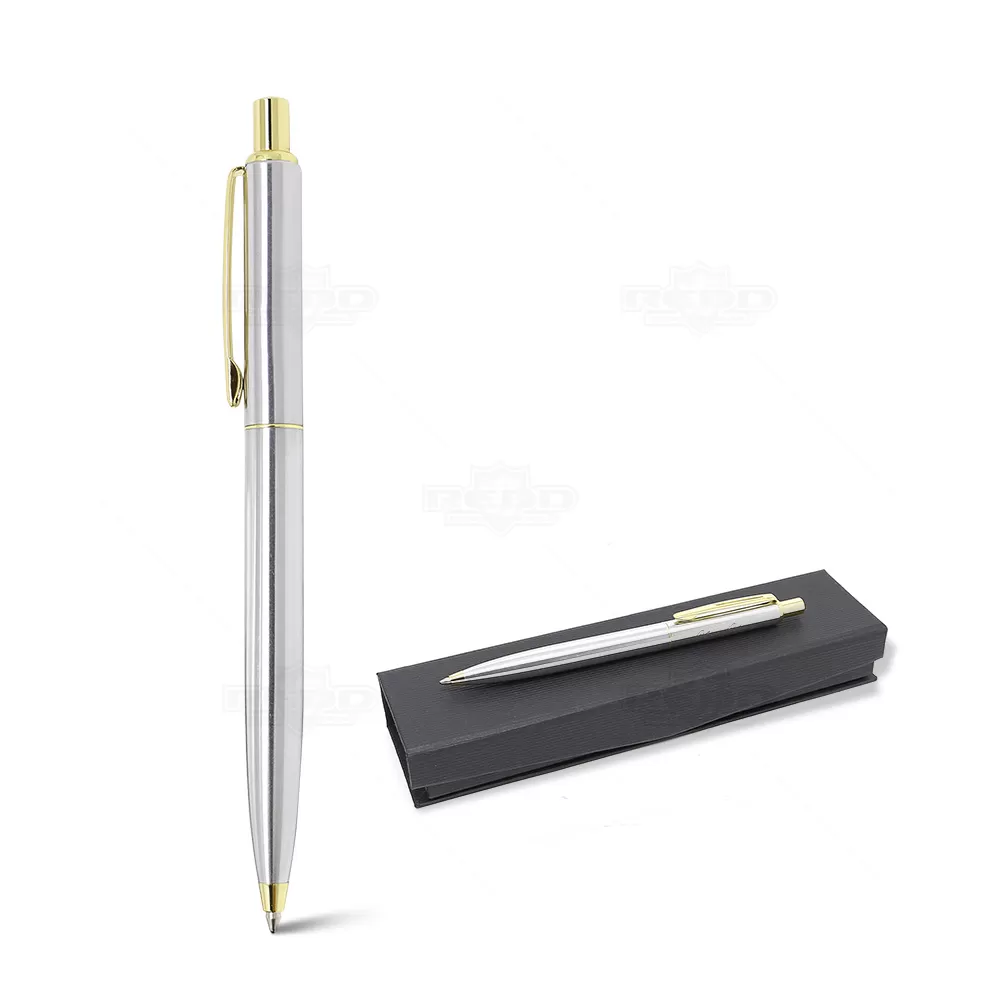 Caneta de metal personalizada, com detalhes em dourado ou prateado, trazendo extrema beleza e elegância a peça, com esferográfica na cor azul e um estojo que acompanha a elegância do produto, produzido em cartonagem "black". Ideal para brindes promocionais e eventos corporativos. *Tamanho do Estojo: 179 x 227 x 428 mm