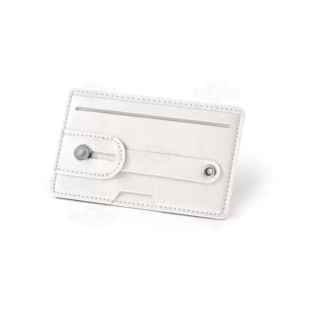 Porta cartão para celular personalizado produzido em couro sintético. Possui bloqueio de RFID Identificação por radiofrequência ou ("Radio-Frequency IDentification" ) é um método de identificação automática através de sinais de rádio, recuperando e armazenando dados remotamente através de dispositivos denominados etiquetas RFID. Capacidade para 2 cartões, acabamento em costura diferenciado, alça de dedo frontal ajustável, fita PU adesiva na parte traseira permitindo-lhe ser adaptável a um smartphone. Ideal para brindes promocionais e eventos corporativos. Smartphone e cartões não acompanham o produto.