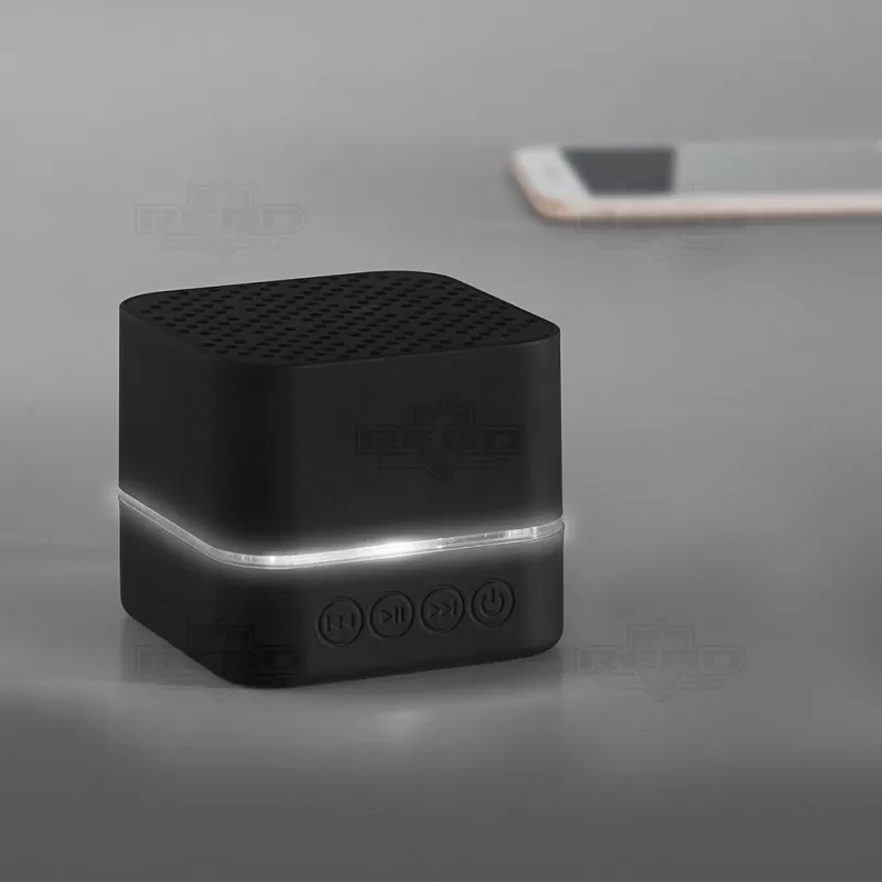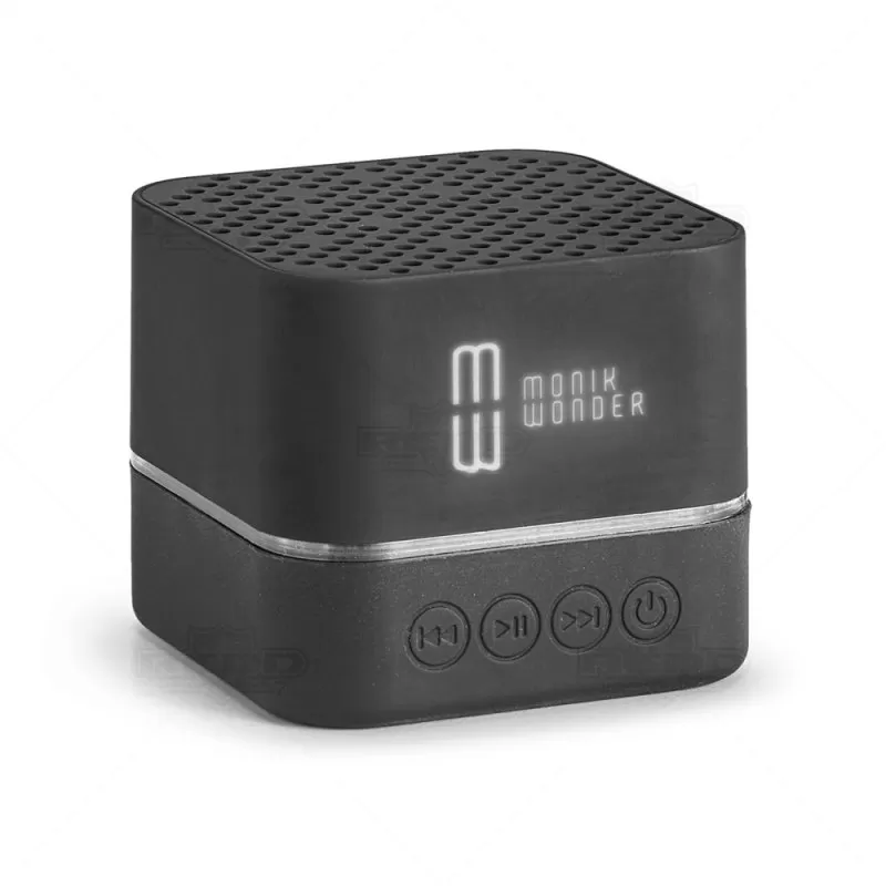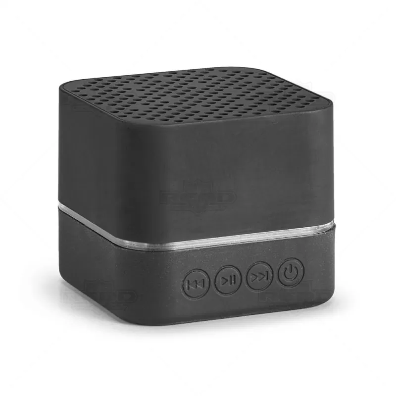 Caixa de som personalizada produzida em ABS com acabamento emborrachado. Possui entrada micro-USB, bateria com 300mAh, cabo 2 em 1: USB - micro USB para carregamento e micro USB - 3.5 e transmissão sem fio via Bluetooth. A gravação do logotipo é um processo de corrosão no material emborrachado do produto que se ilumina com a luz de LED quando a a caixa de som estiver em atividade. Ideal para brindes promocionais e eventos corporativos. Smartphone não acompanha o produto.