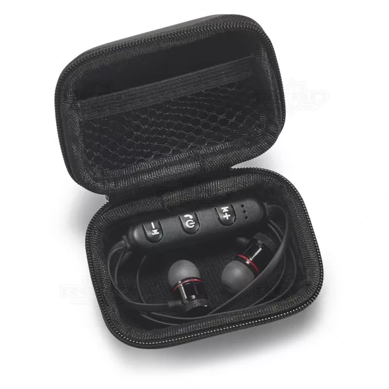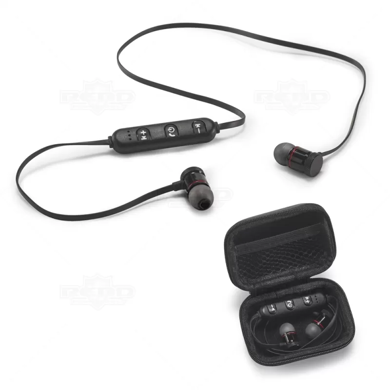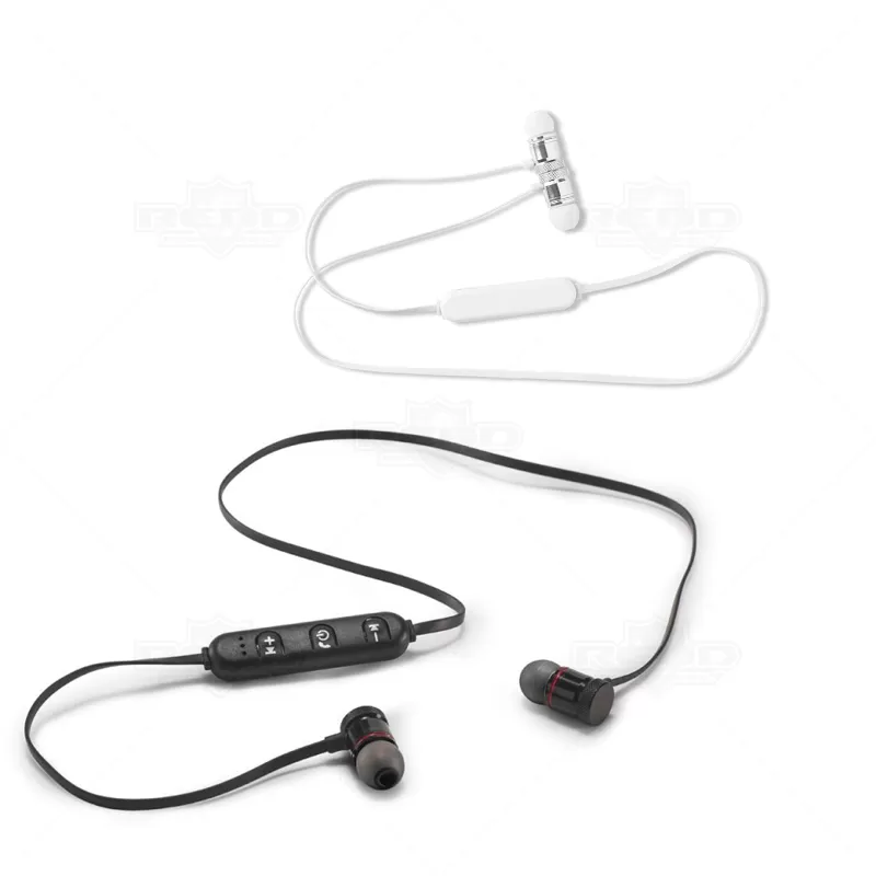 Fone de ouvido bluetooth personalizado com transmissão de músicas sem necessidades de fios. Produzido com materiais resistentes, possui transmissão por bluetooth 4.1, autonomia de até 3 horas, função para atender chamadas, controlo de volume, conexão à playlist do dispositivo móvel e estojo personalizado em E.V.A. Inclui cabo USB/micro USB para carregamento. Ideal para brindes promocionais e eventos corporativos.
