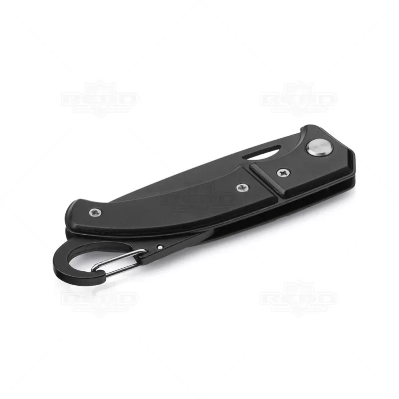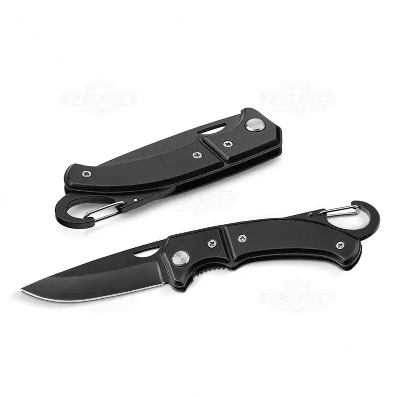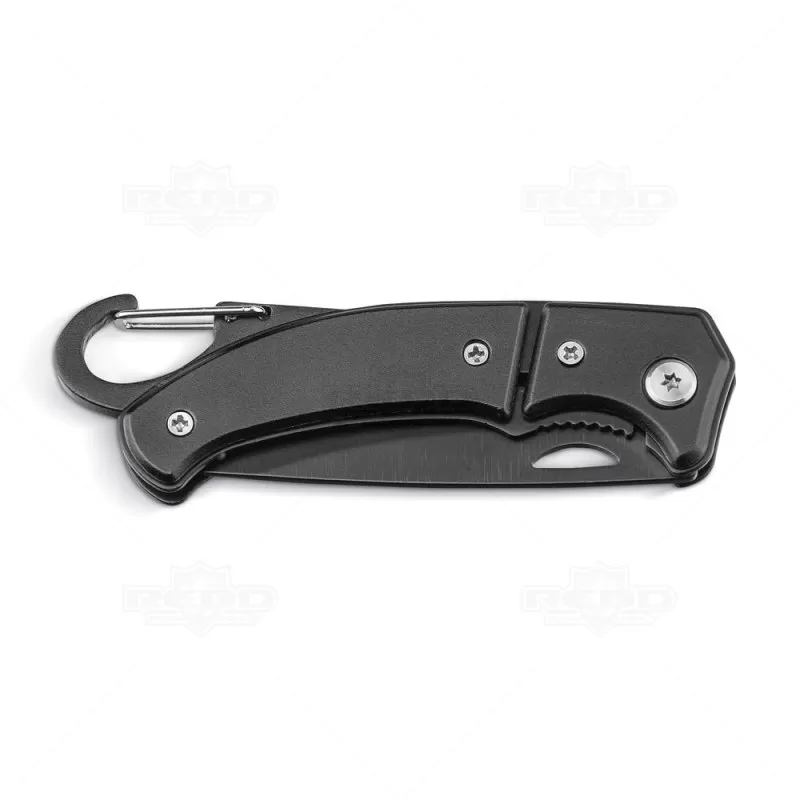 Canivete de metal personalizado produzido em aço inoxidável, possui mosquetão diferenciado para fixação em mochila e cós de calça, lâmina diferenciada cortante e detalhe inferior do cabo serrilhado para abertura e cortes de objetos.