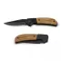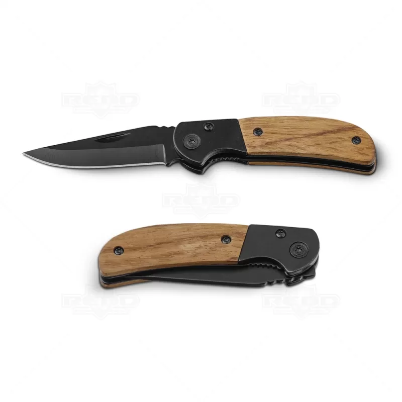 Canivete de metal personalizado produzido em aço inoxidável com acabamento em madeira, possui fecho de segurança, lâmina diferenciada cortante, detalhe inferior do cabo serrilhado para abertura e cortes de objetos e acabamento e madeira personalizada no cabo. Ideal para brindes promocionais e eventos corporativos.