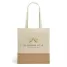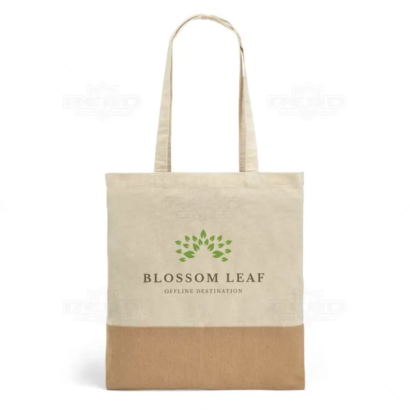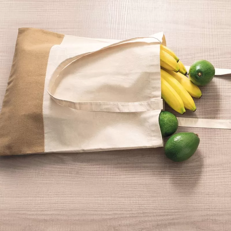 Sacola ecológica personalizada produzida em tecido 100% algodão 160 g/m². Possui amplo espaço, alças de 65 cm e detalhe inferior em tecido de juta. Ideal para brindes promocionais e eventos corporativos. Alimentos não acompanham o produto.