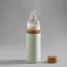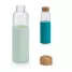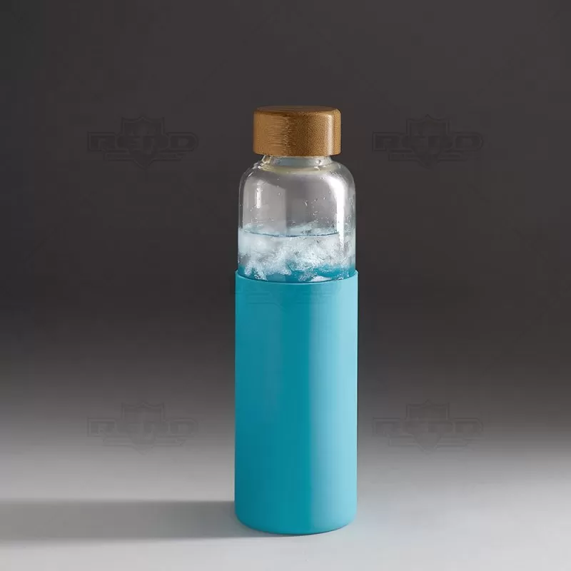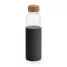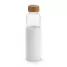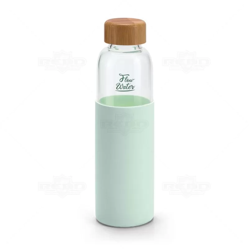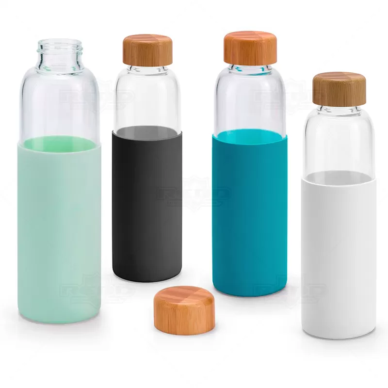Squeeze personalizado com capacidade para 600ml produzida em vidro borossilicato. Possui tampa rosqueável em bambu com vedação para evitar o vazamento do líquido, e capa personalizada revestida de silicone . Ideal para divulgar sua empresa em eventos corporativos, brindes personalizados e campanhas promocionais. Imagem ilustrativa.