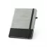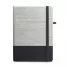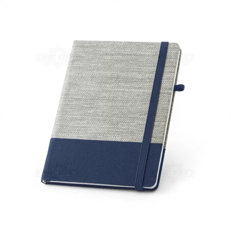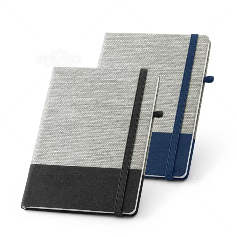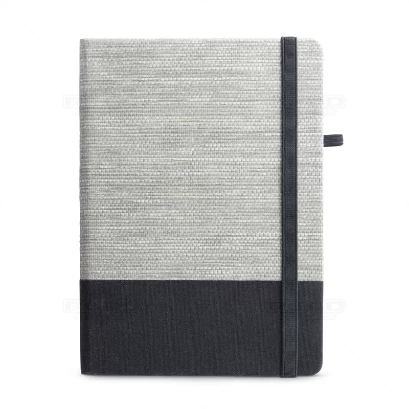 Bloco de anotações com pautas personalizado, produzido com material composto por palha e algodão canvas, possui aproximadamente 96 folhas brancas pautadas, elástico para fechamento do bloco e suporte para caneta esferográfica (não inclusa). Ideal para brindes promocionais e eventos corporativos.