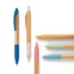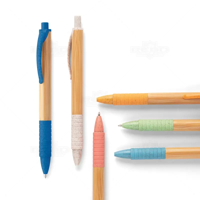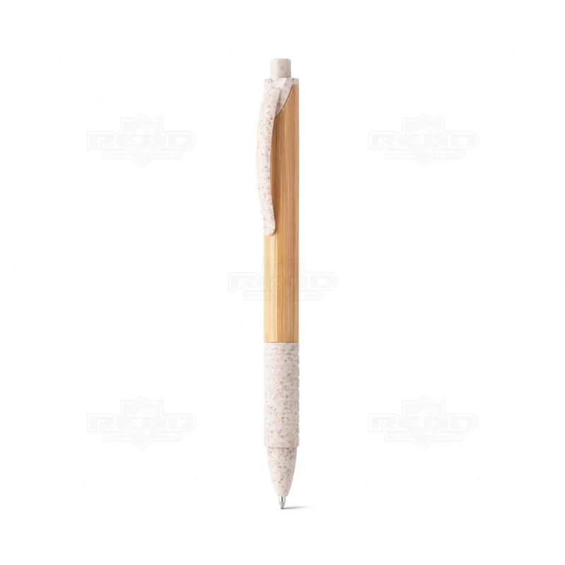 Caneta ecológica personalizada produzida em bambu com clip e elementos em fibra de trigo e ABS, possui esferográfica azul e acionamento da escrita por click. Produto inovador visando campanhas que defendem um mundo mais sustentável. Ideal para divulgar sua empresa em eventos corporativos, brindes personalizados e campanhas promocionais.