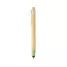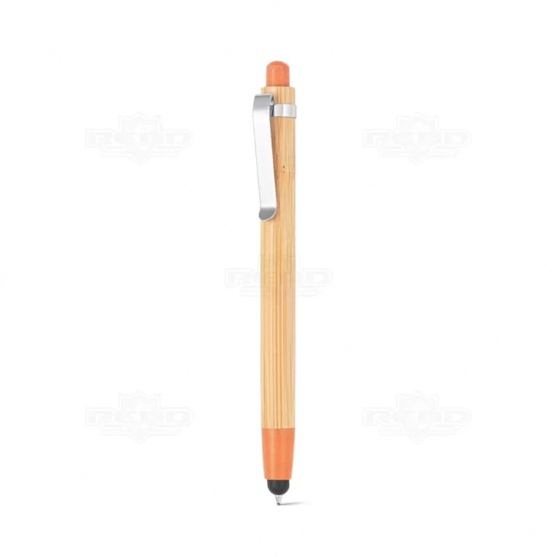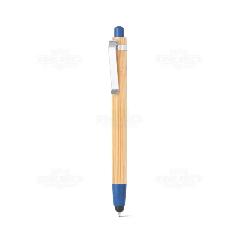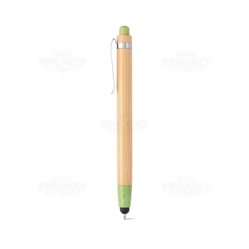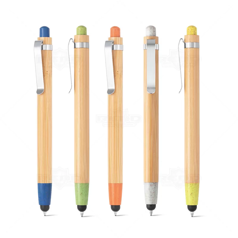Caneta ecológica personalizada produzida em bambu com clip de metal, elementos em fibra de trigo e ABS além de possui ponteira touch também, ideal para uso em tablets e smartphones. Possui esferográfica azul e acionamento da escrita por click. Produto inovador visando campanhas que defendem um mundo mais sustentável. Ideal para divulgar sua empresa em eventos corporativos, brindes personalizados e campanhas promocionais.