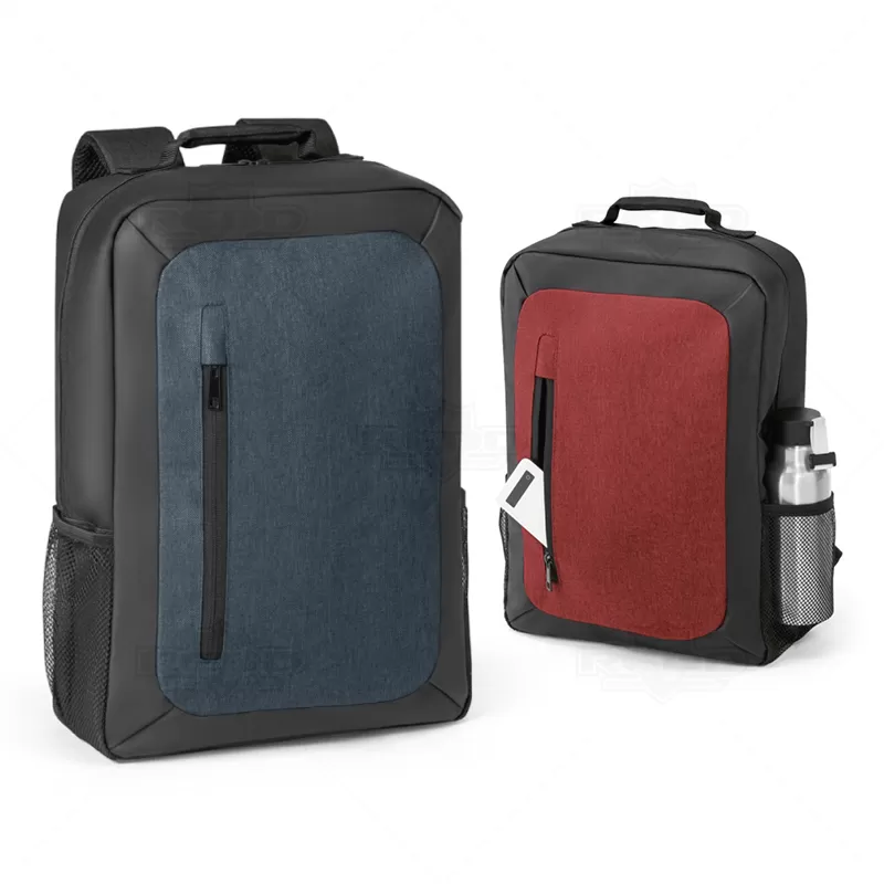 Mochila para notebook personalizada produzida em nylon 600D de alta densidade e poliéster 600D impermeável. Possui compartimento principal almofadado para notebook de até 15.6'', bolso frontal com zíper, dois bolsos laterais em tela, parte posterior almofadada com sistema de apoio acolchoado para as costas e alças ajustáveis e almofadadas. Objetos decorativos não acompanham o produto.