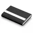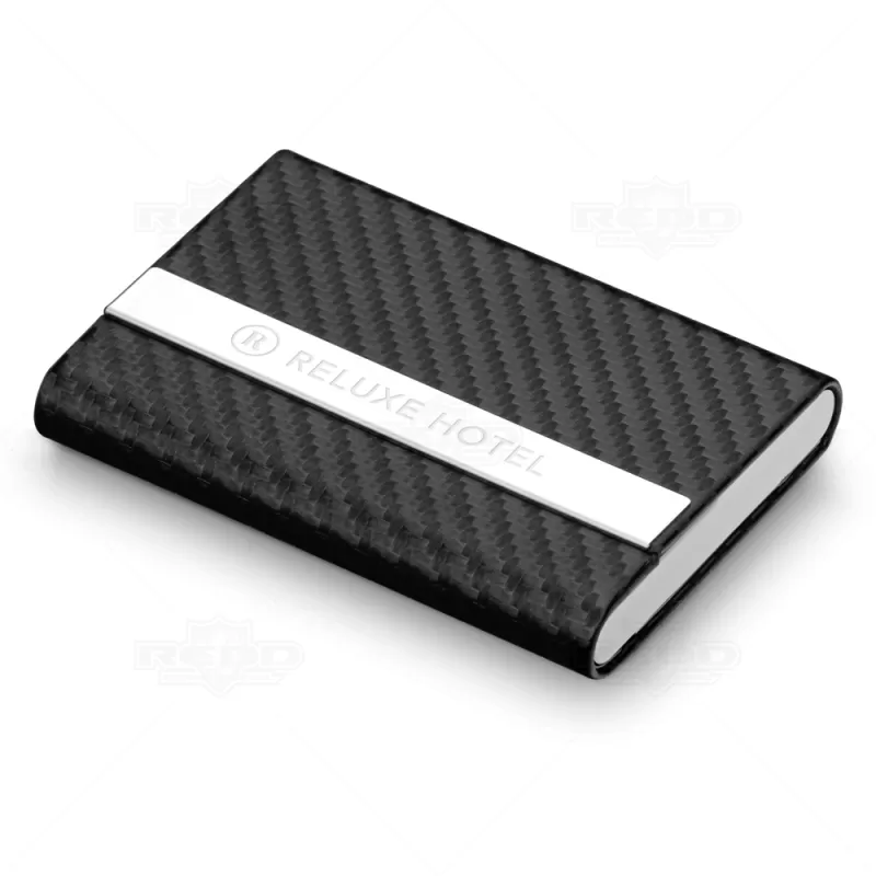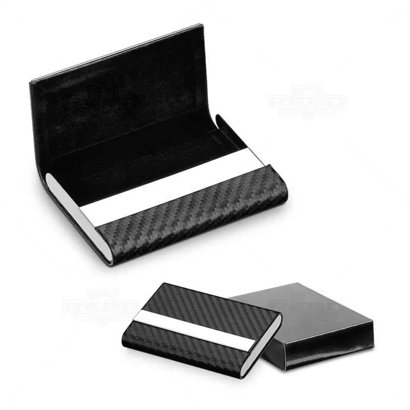 Porta cartão personalizado produzido em metal com acabamento diferenciado em material sintético, possui compartimento com acabamento aveludado e fechamento por imã. Ideal para brindes promocionais e eventos corporativos.