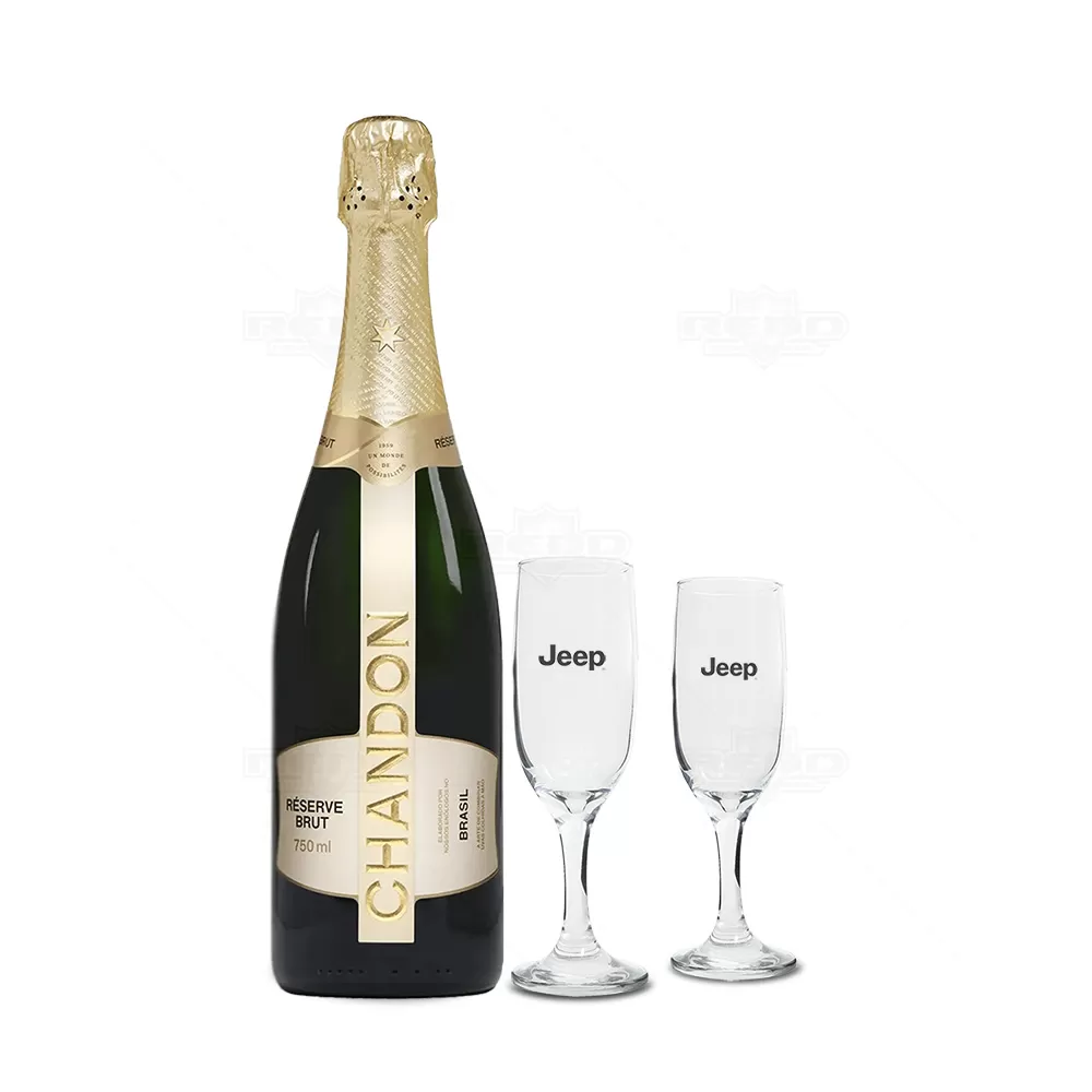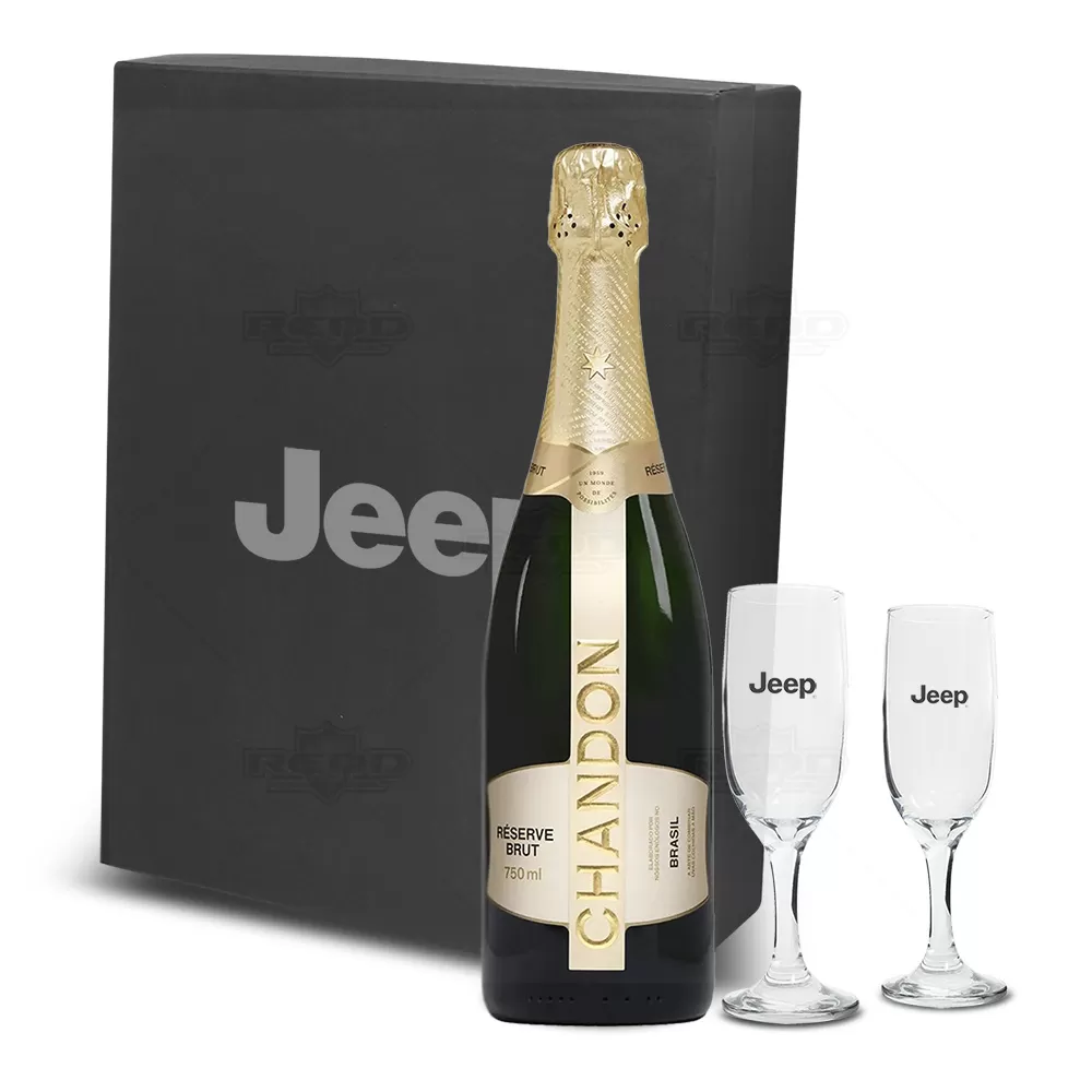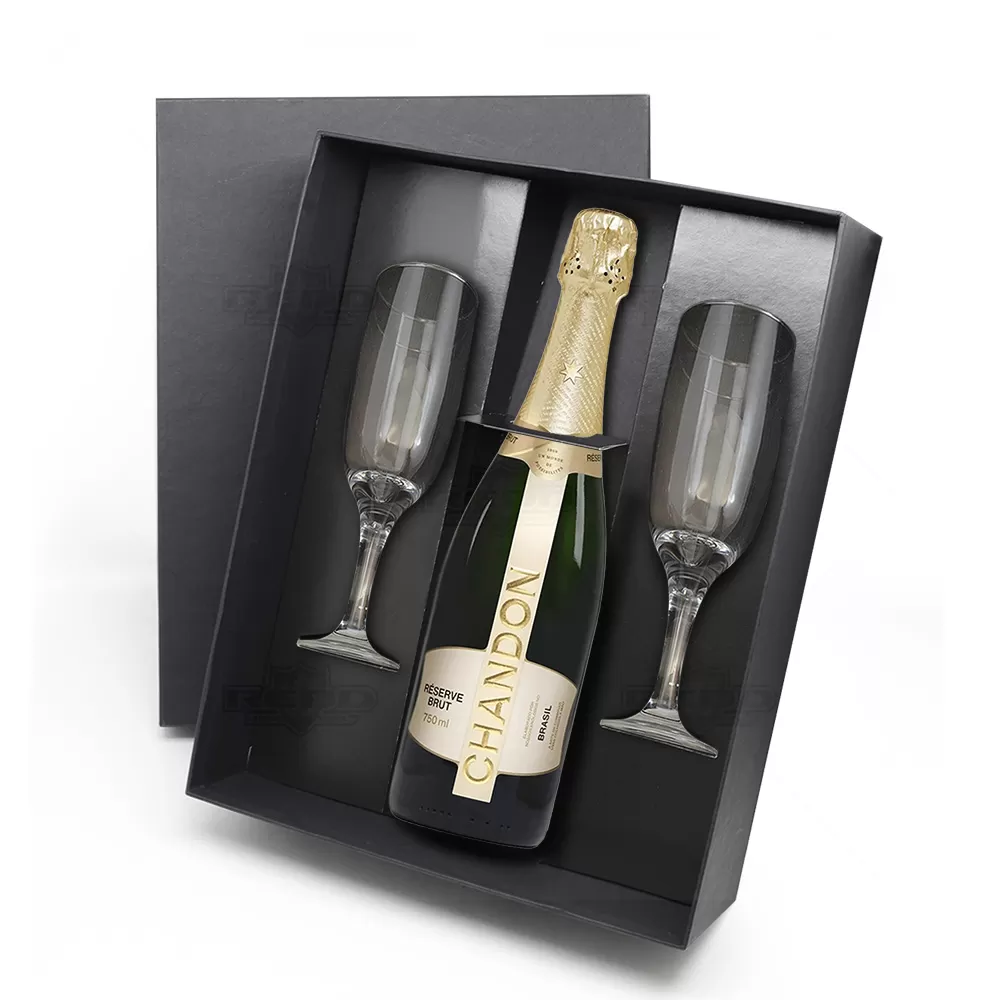 Kit espumante com 1 Chandon BRUT 750 ml e duas taças personalizadas de vidro com capacidade para 180 ml. Possui embalagem elegante com 1 Chandon BRUT 750 ml, teor Alcoólico: 11,8% com paladar frutado, mostra notas florais, e delicado aroma de pão fresco. A elegância garantida pelo frescor e a perlage fina envolvem a boca e associam-se às notas de frutas cítricas e secas, e duas taças de vidro com haste curta e bojo reforçado. A embalagem confeccionada em caixa cartonada com papel Paraná, revestida em Off-Set preto 120g/m² tornando o brinde ideal para presentear executivos, colaboradores e parceiros.