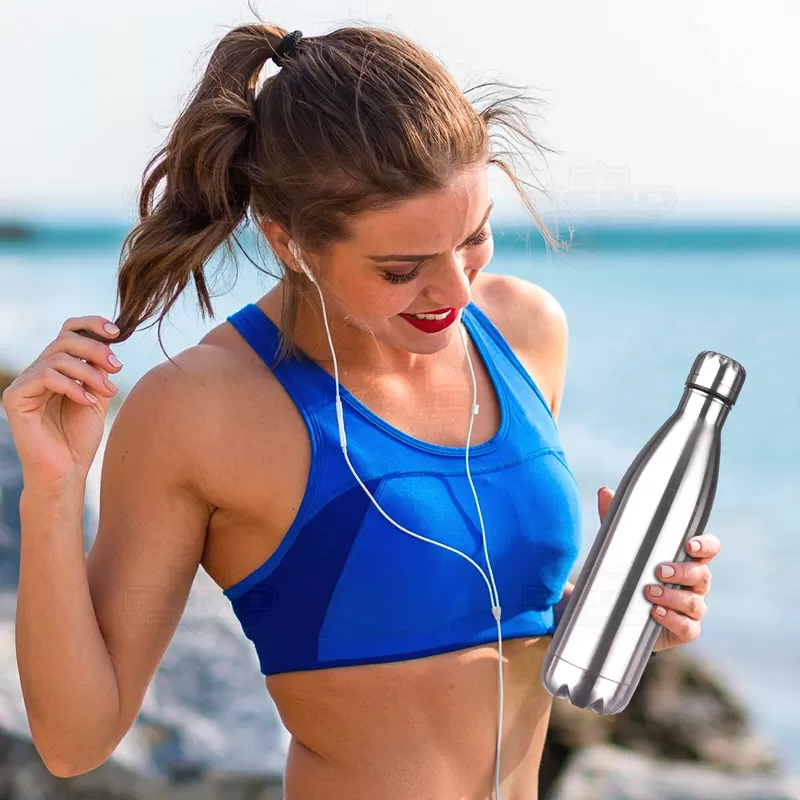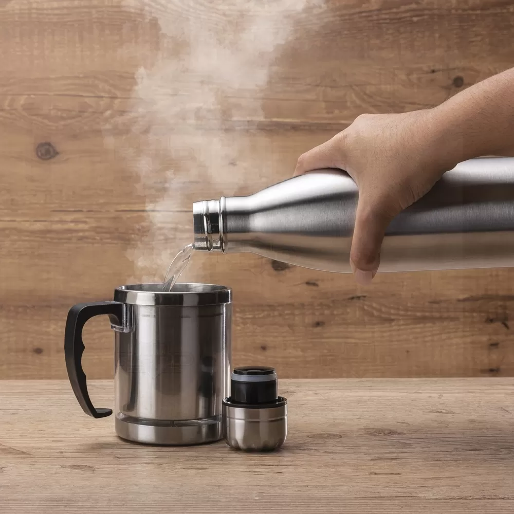Squeeze térmico personalizado, produzido em aço inox e com capacidade de 780ml. Por seu revestimento térmico, pode ser utilizada com líquidos quente ou frios e tampa rosqueável com anel de vedação que impede o vazamento da bebida. Ideal para brindes promocionais e eventos corporativos. Imagem ilustrativa, itens decorativos não acompanham o produto.