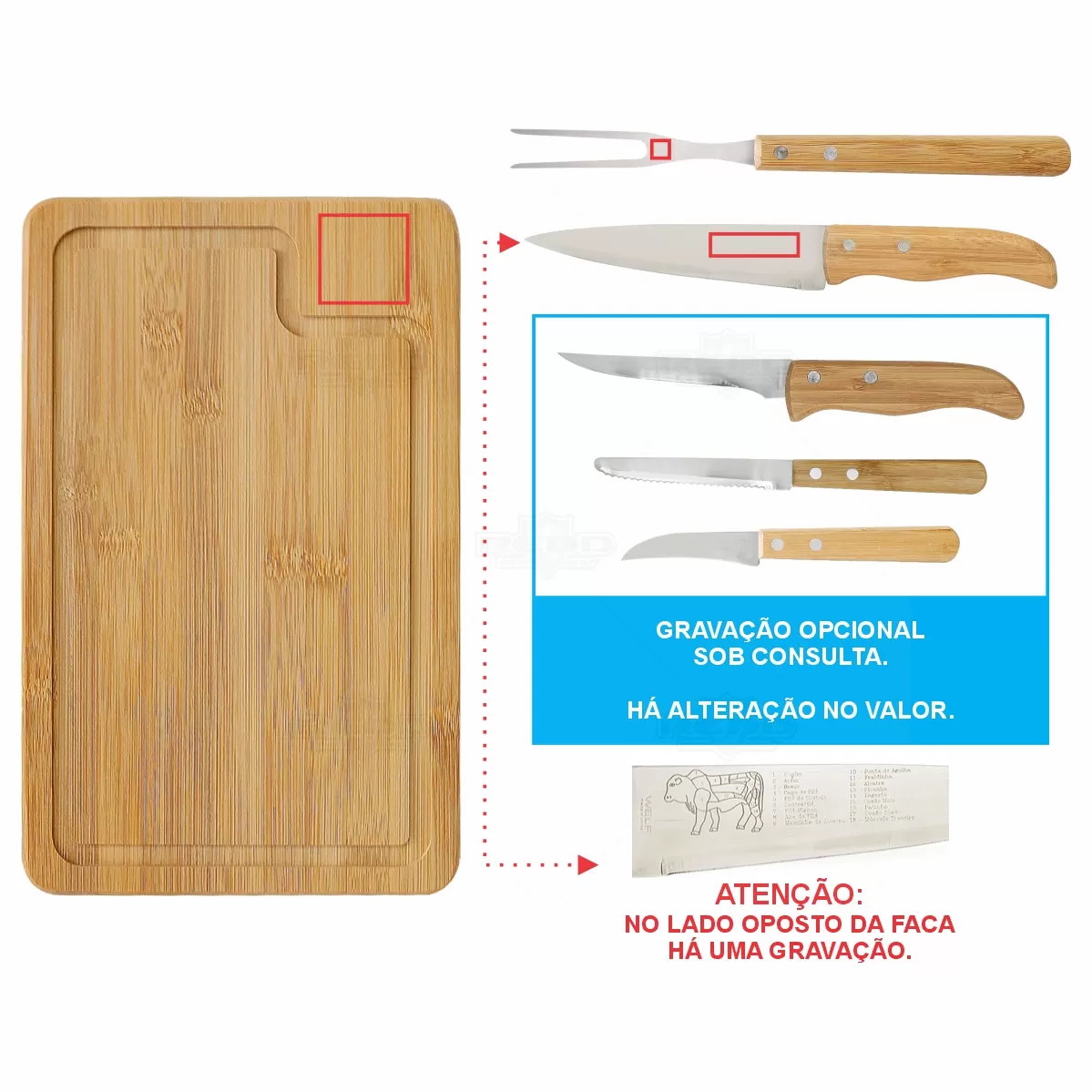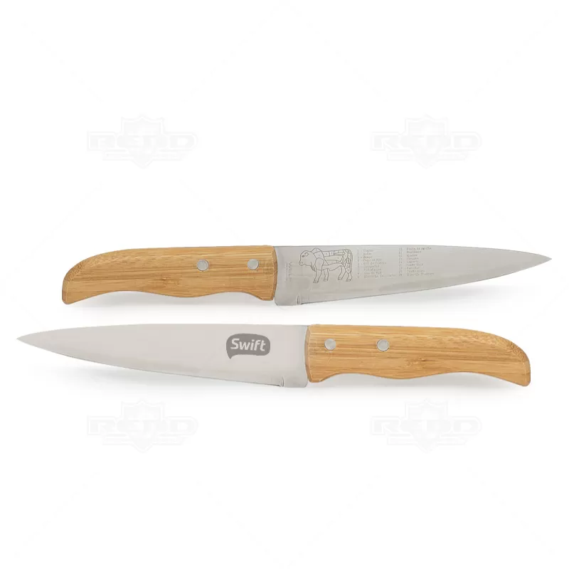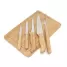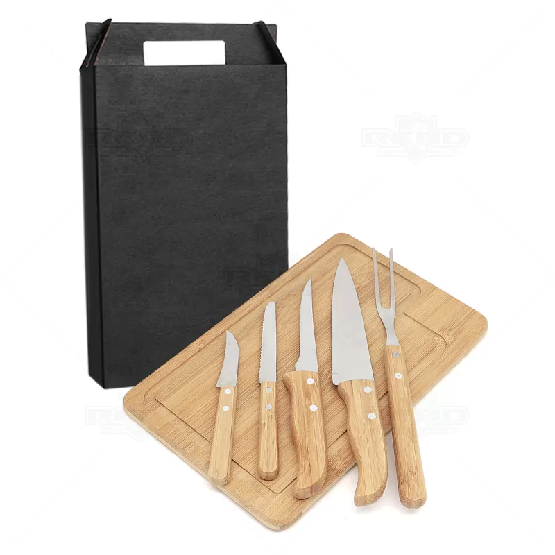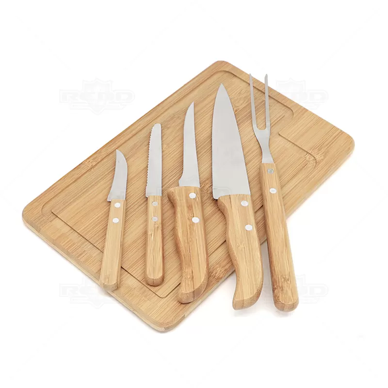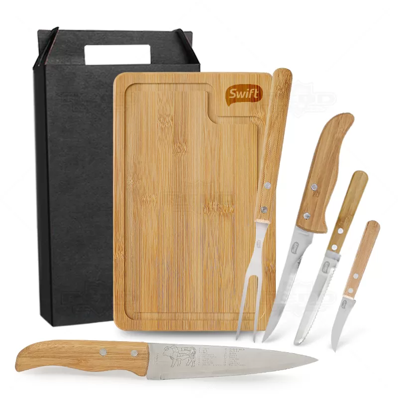 Kit churrasco com 6 peças sendo elas: 1 Facas de corte para carne, 1 Faca para desossar, 1 Faca de legumes, 1 Faca de legumes, 1 Garfo trinchante e 1 tábua em bambu retangular em tripla camada invertida de com sulco nas extremidades. As lâminas em aço inox com rebites resistentes e os cabos em bambu possuem tratamento especial, oferecendo maior durabilidade às peças. Ideal para eventos gastronômicos, brindes promocionais e eventos corporativos.