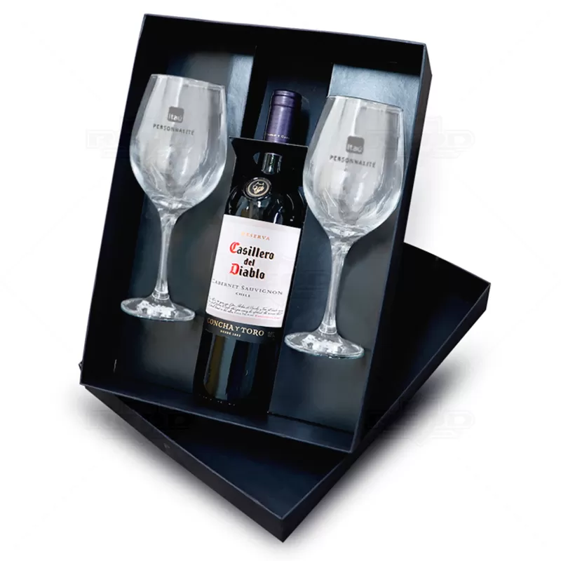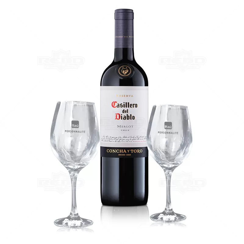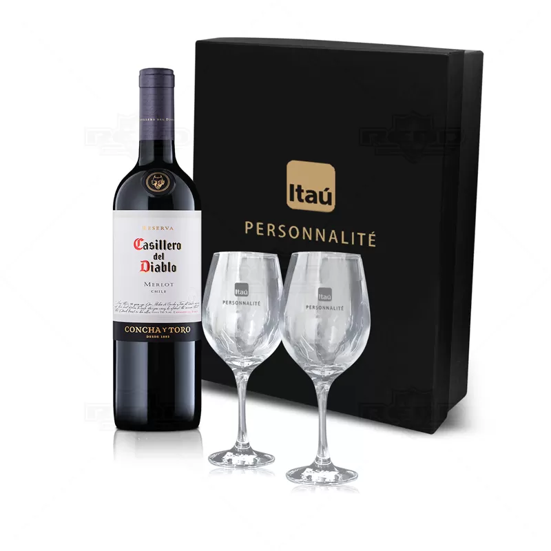 Kit Vinho personalizado com 1 Garrafa de vinho Casillero del Diablo de 750ml, 2 taças de Vidro de 490ml com bojo grande, haste longa, boca fechada para melhor concentração do aroma e embalagem confeccionada em caixa cartonada com papel Paraná, revestida em Off-Set preto 120g/m². Visual elegante e contemporâneo, É o presente ideal para presentear colaboradores, fornecedores e clientes em momentos memoráveis.