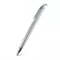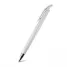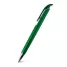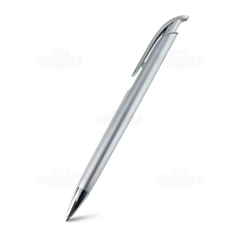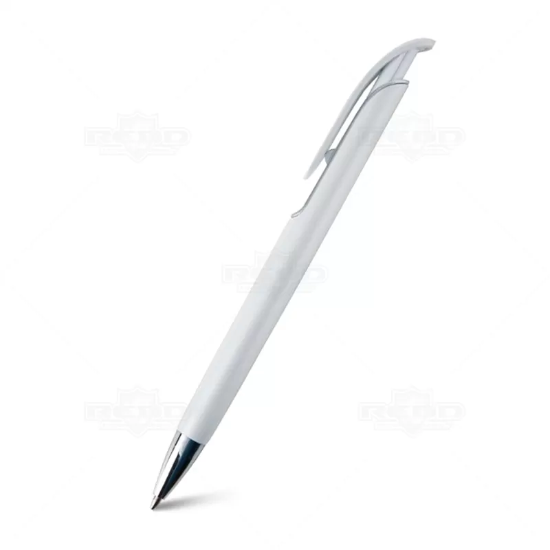 Caneta plástica personalizada com design inovador, possui detalhe colorido, clip plástico, ponteira de metal e acionamento da escrita por click. Ideal para brindes promocionais e eventos corporativos.