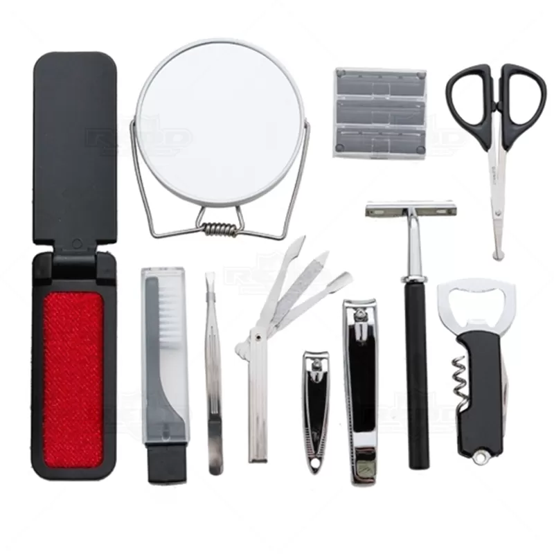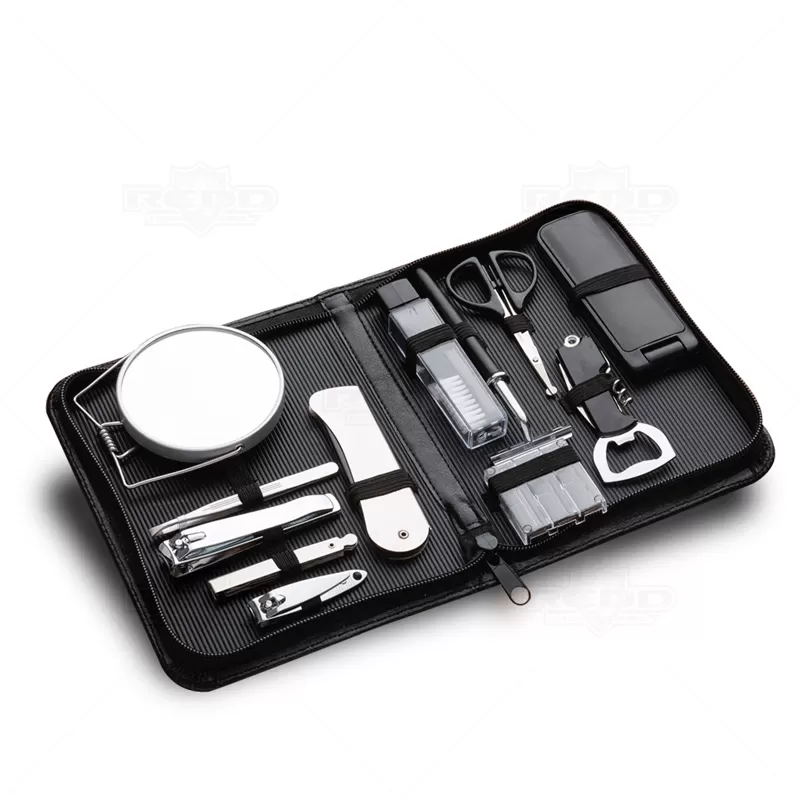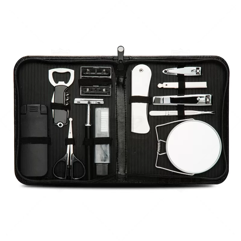 Kit masculino personalizado, contendo 12 peças acondicionadas em estojo de couro sintético . Possui parte interna revestida com plástico em relevo e elástico para fixação dos itens. Composto por 1 removedor de pelos, 1 abridor e saca rolha, 1 tesoura, 1 aparelho de barbear, 3 lâminas para barbear, 1 escova de dentes, 1 pente, 1 cortador de cutícula, 1 mini kit unha 3 em 1 (empurrador de cutícula, lixa, limpador de unha), 1 cortador de unha, 1 pinça e 1 espelho duplo com aumento. Ideal para brindes promocionais e eventos corporativos.