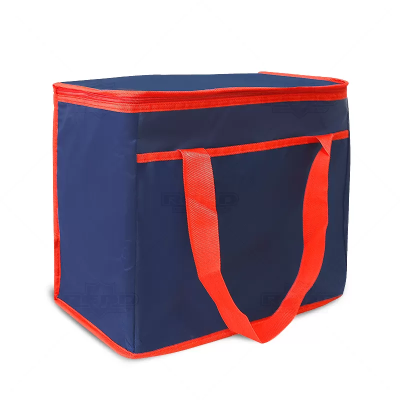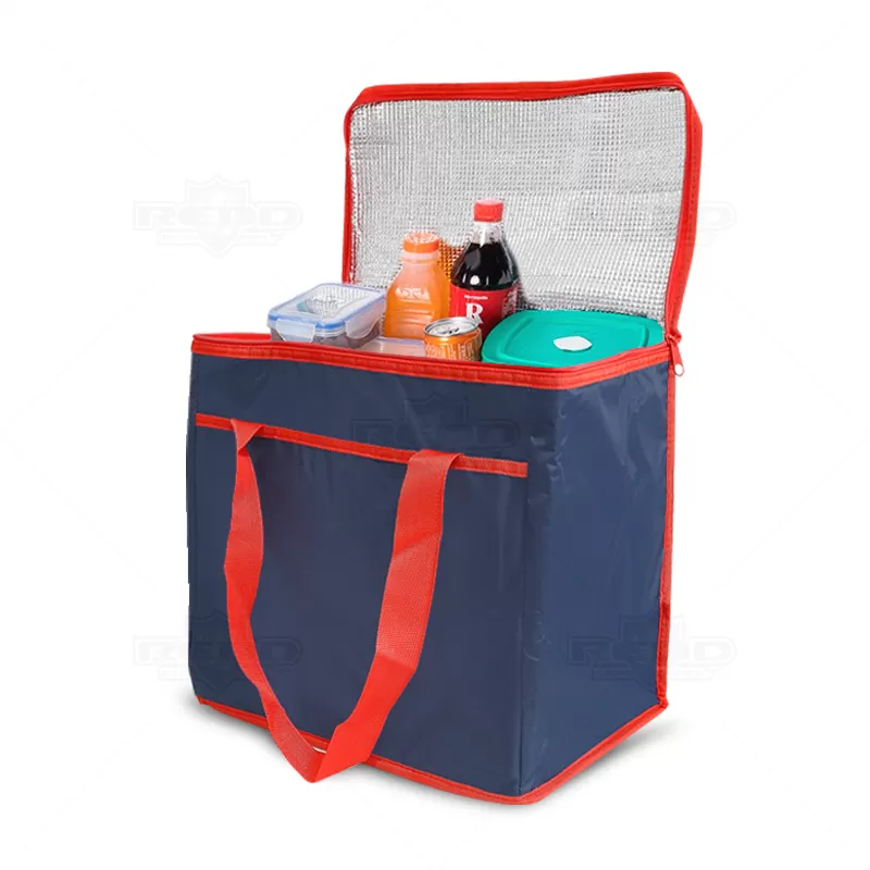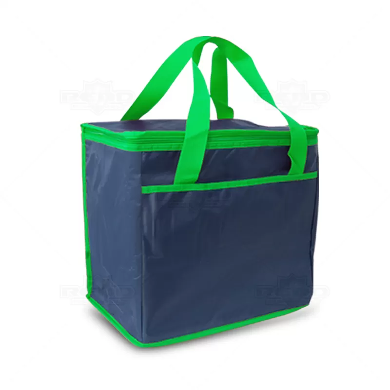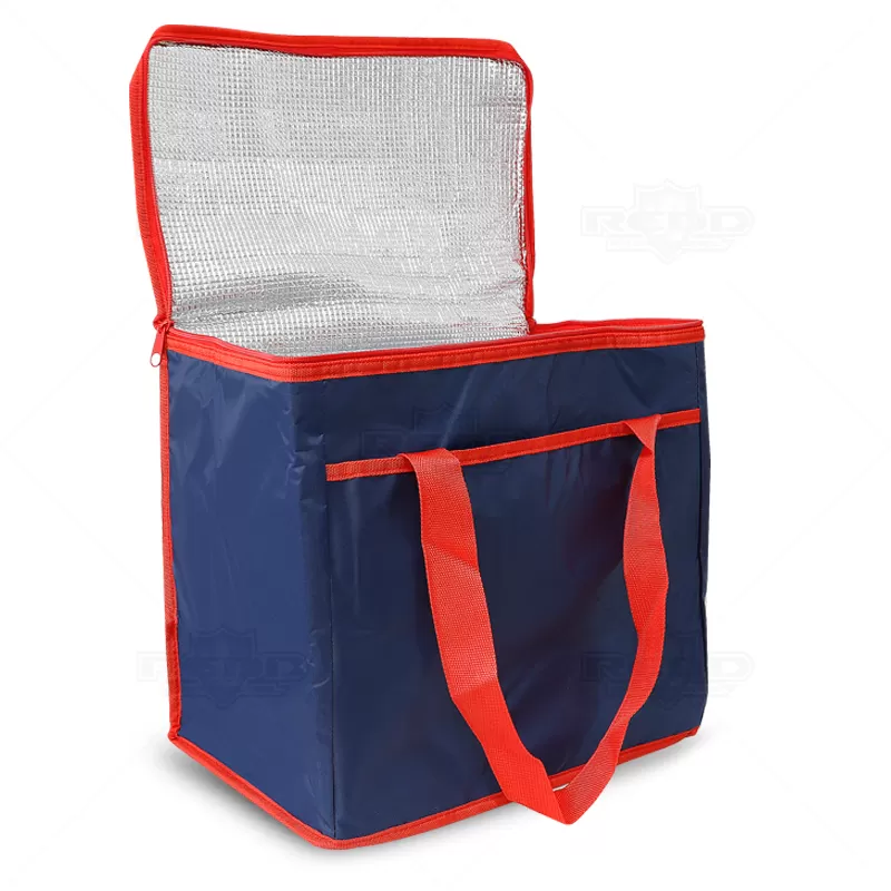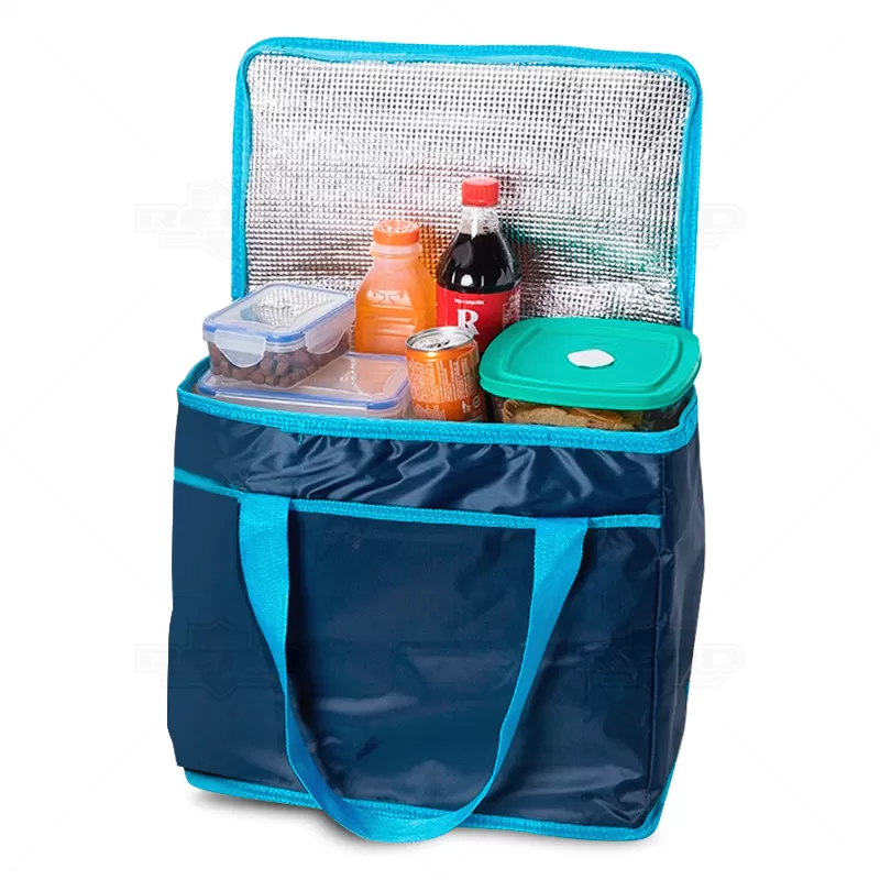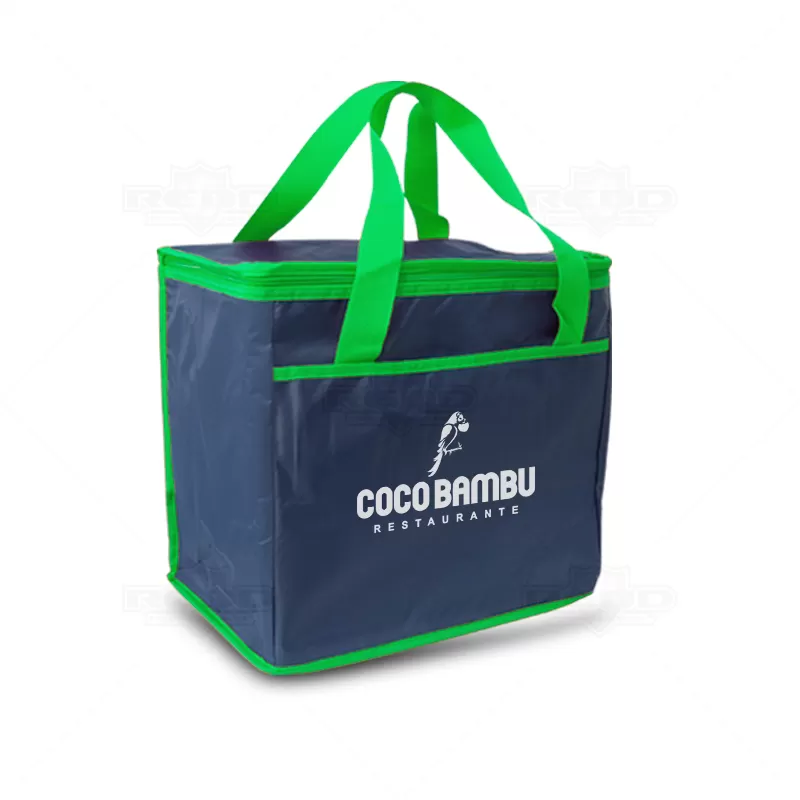 Bolsa térmica personalizada produzida em poliéster com capacidade para até 33 litros. Possui área interna com revestimento térmico ideal para manter / conservar a temperatura dos alimentos e bebidas por mais tempo, bolso frontal externo, tampa com fechamento por zíper duplo e alças de mãos para transporte. Ideal para brindes promocionais e eventos corporativos. Imagem ilustrativa, itens internos não acompanham o produto. *Não é adequado colocar gelo pois por mais que a bolsa conserve a temperatura o gelo irá derreter e vazar pela costura, caso o objetivo principal seja a utilização de gelo, opte por nossas opções de coolers.