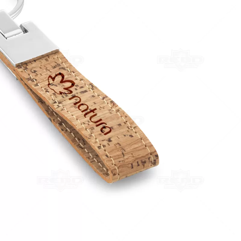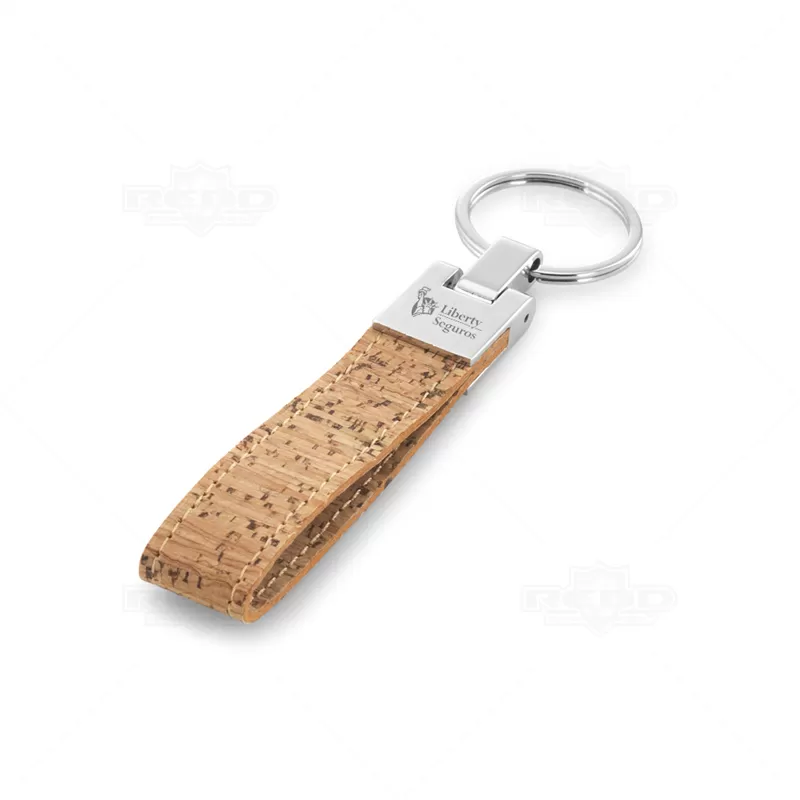 Chaveiro de metal com detalhe em cortiça personalizado. Possui alça em cortiça com acabamento em costura, detalhe em metal superior articulado e argola de metal para chaves. Ideal para brindes promocionais e eventos corporativos.