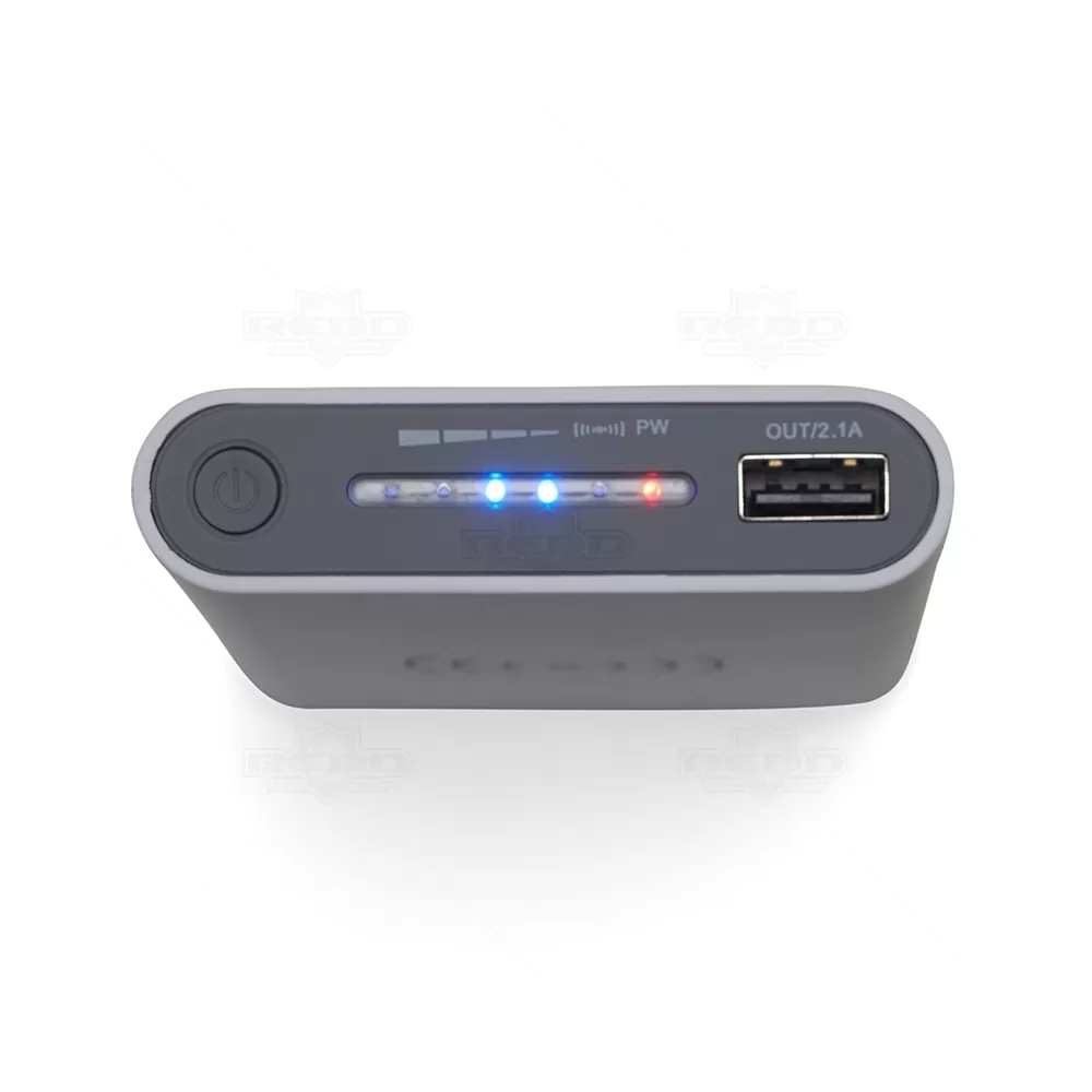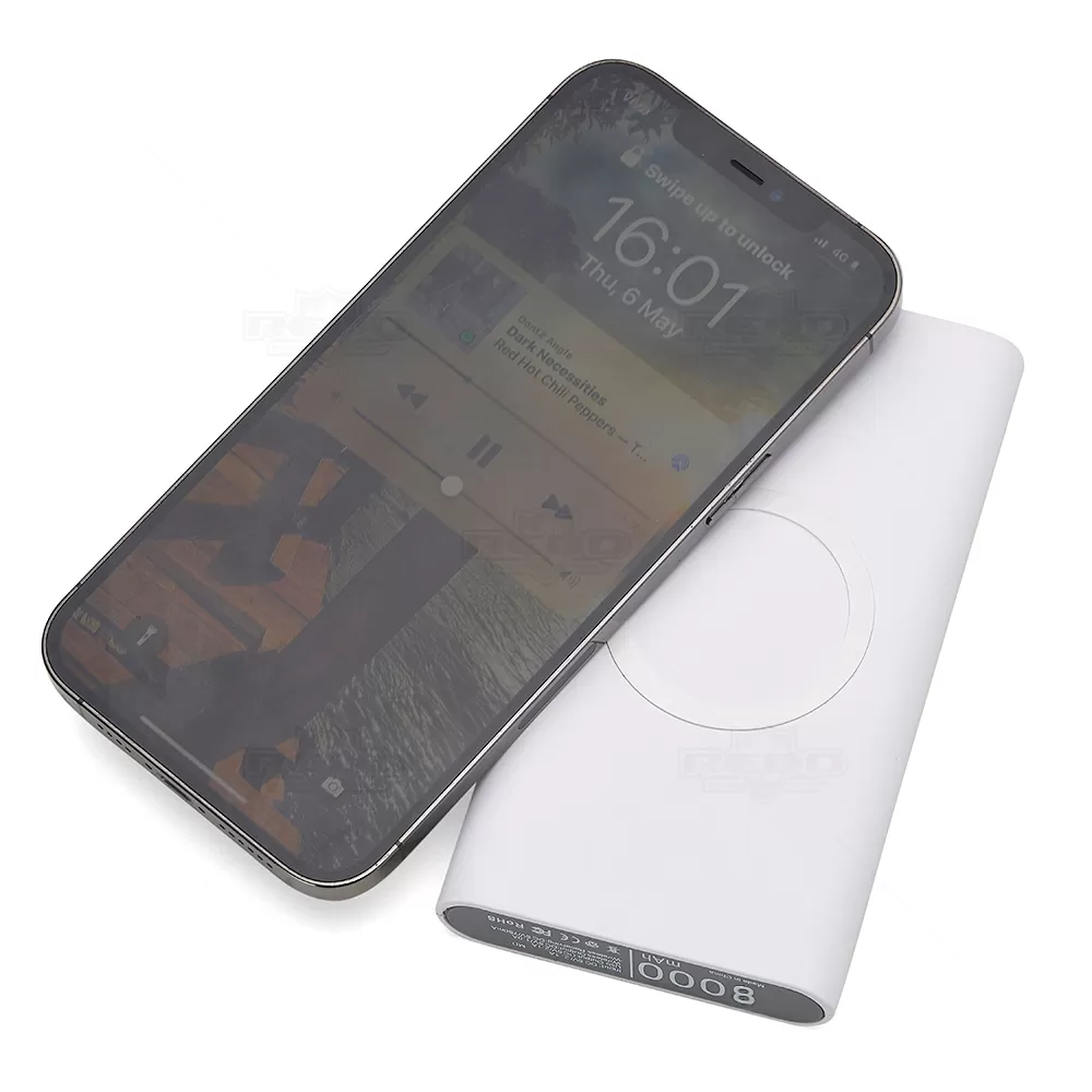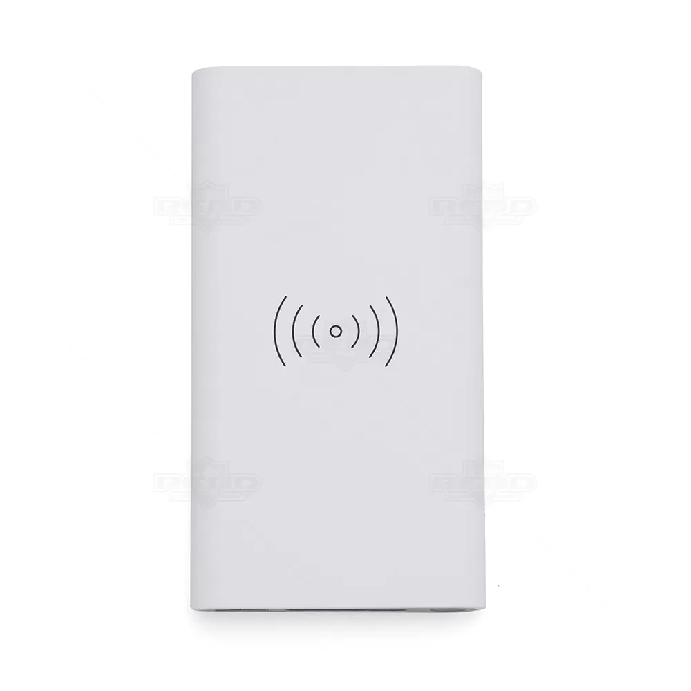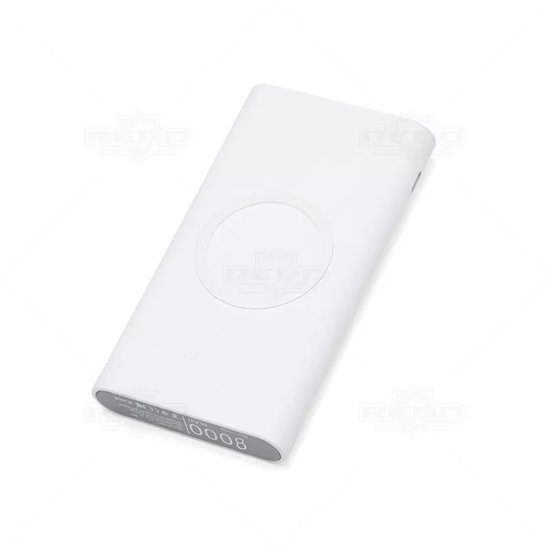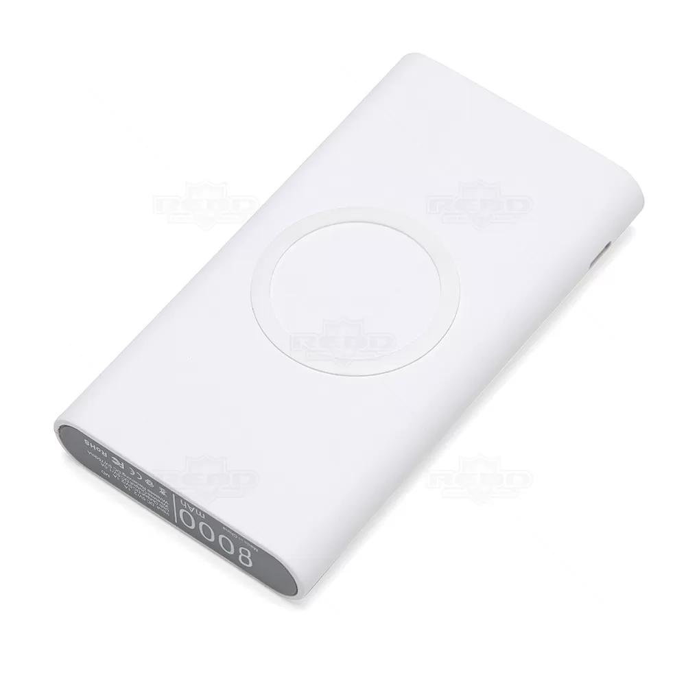 Carregador personalizado portátil de indução com 8000mAh e indicadores led de bateria e indução. O carregador contém um detalhe circular emborrachado na área de indução, proporcionando mais segurança ao dispositivo conectado, evitando deslizamentos durante este modo de carga – o lado oposto da indução possui um ícone indutivo, porém é uma mera ilustração, esta área não gera carga. O carregador possui uma porta de saída USB com carga rápida e duas portas de entradas, Tipo-C e V8. Entrada: DC 5V/2.1A, Saída: DC 5V/2.1A, Saída wireless: DC 5V/1.0A, Receptor wireless: DC 5V/750mA. Acompanha cabo USB.