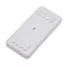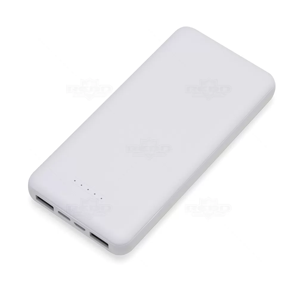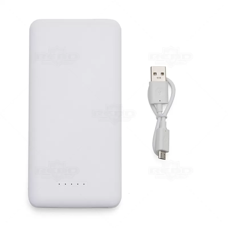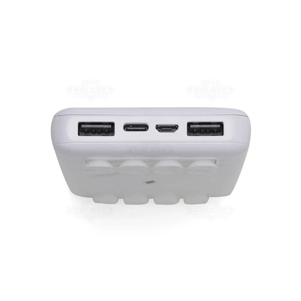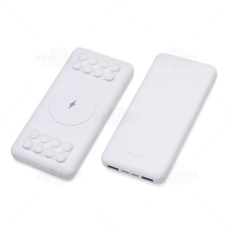 Carregador por indução wireless personalizado com 10.000mAh e indicador led de bateria, contém dois conjuntos de ventosas nas extremidades da área de indução, ideal para fixação do celular durante este modo de carga. O carregador possui duas portas de saídas USB, possibilitando o carregamento de dois dispositivos ao mesmo tempo, além do modo de carga por indução ilustrado por um raio, indicando a área correta para este modo de carga. O carregador possui duas portas de entradas, Tipo-C e V8. Acompanha cabo USB Micro USB.
