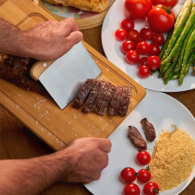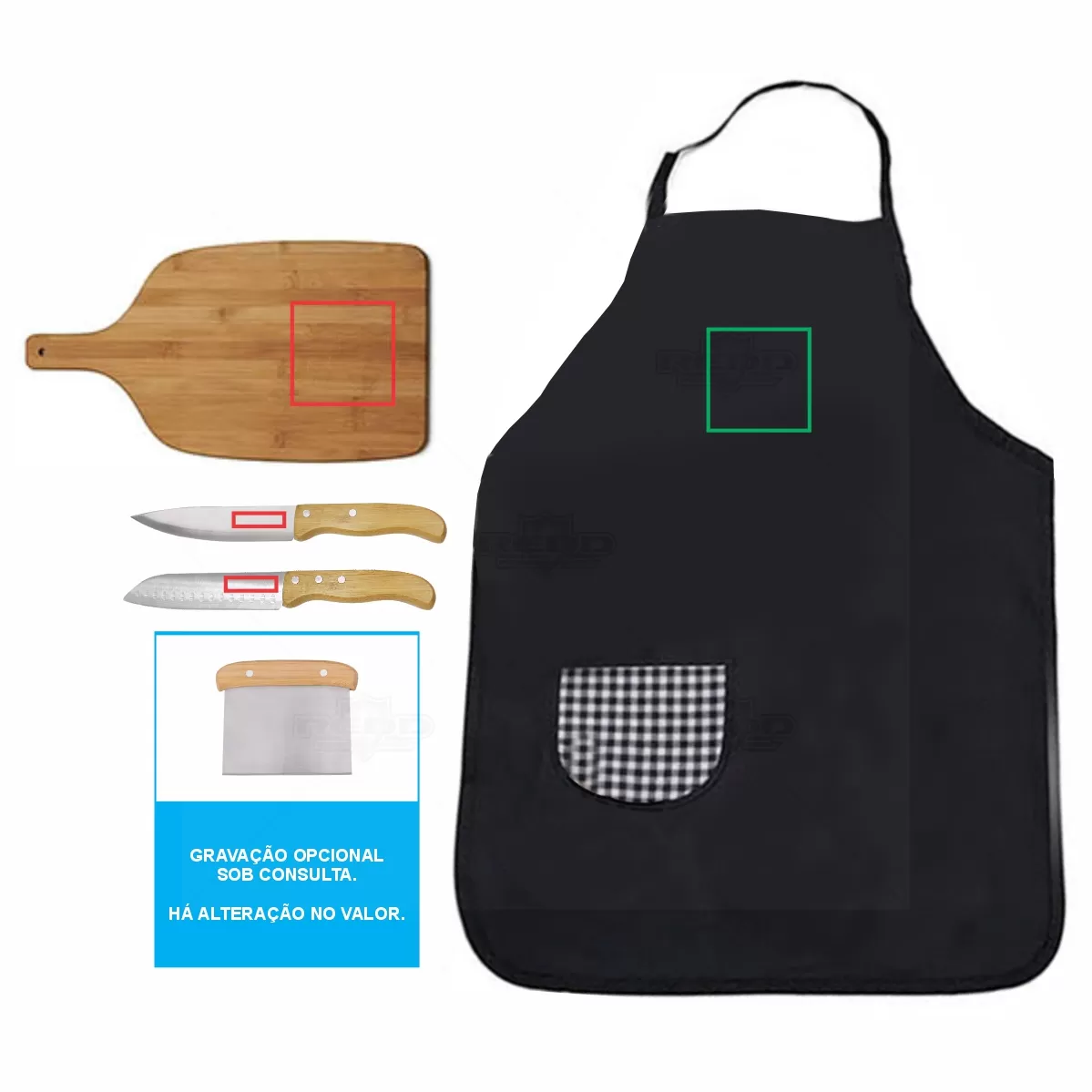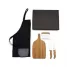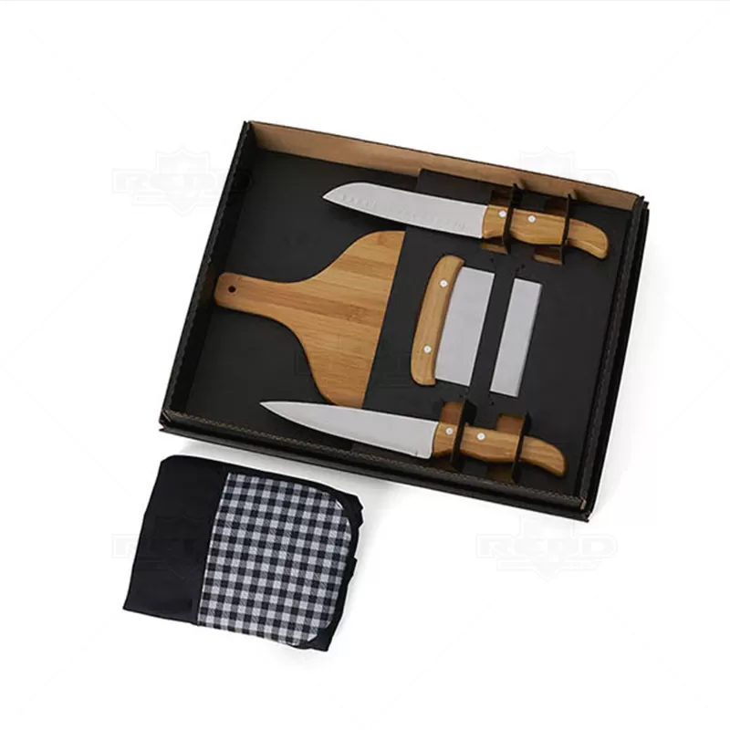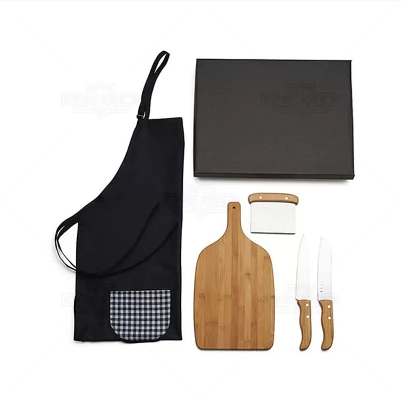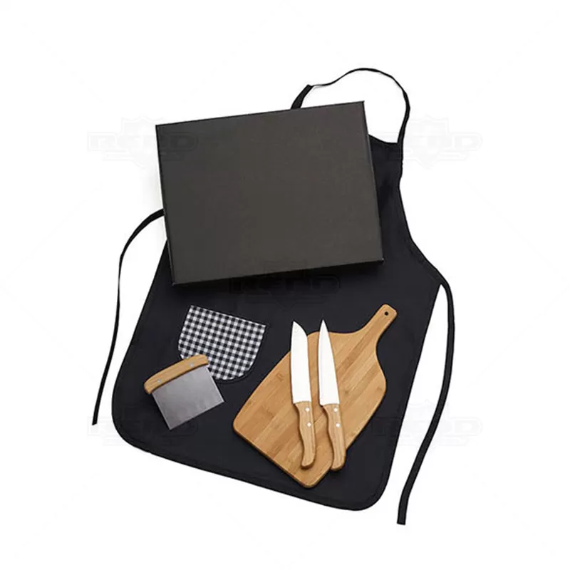 Kit churrasco personalizado com 5 peças, Possui 1 tábua em Bambu, 1 faca 7'', 1 faca santoku e 1 espátula multiuso em Bambu/Inox; avental em Brim. Tábua confeccionada com tripla camada invertida, para dar maior durabilidade e não deformar com o passar do tempo. Rebites em Aço Inox 304, um dos mais resistentes à ferrugem e corrosão. Ideal para brindes promocionais e eventos corporativos. *Imagem ilustrativa, alimentos não acompanha o produto. Espátula: 13,5x11,5cm / Tábua: 39,5x21,5x1,5cm / Avental aberto: 79x54,5cm - Não grava na embalagem