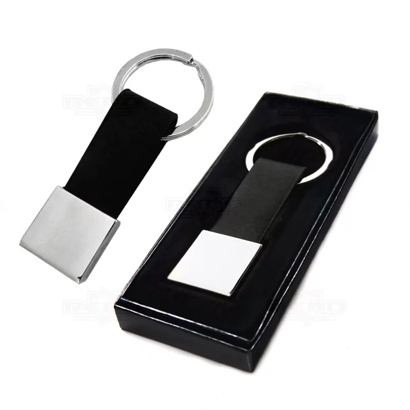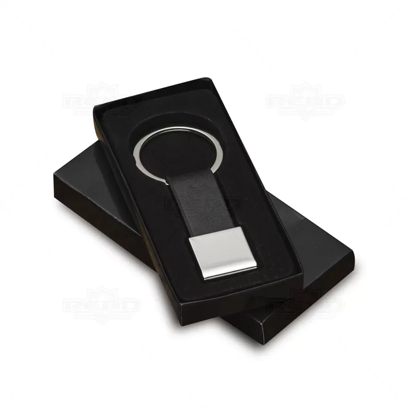 Chaveiro de metal com detalhe em couro sintético possui metal quadrado com alça de couro sintético frente lisa e verso com detalhe do parafuso. Embalagem, caixinha de papelão resistente.