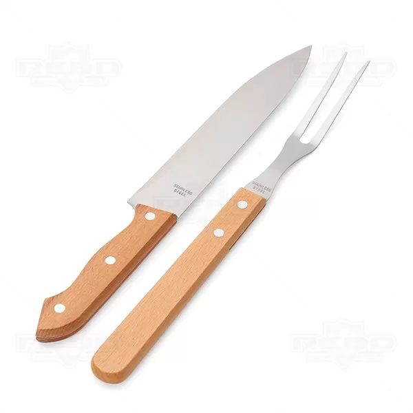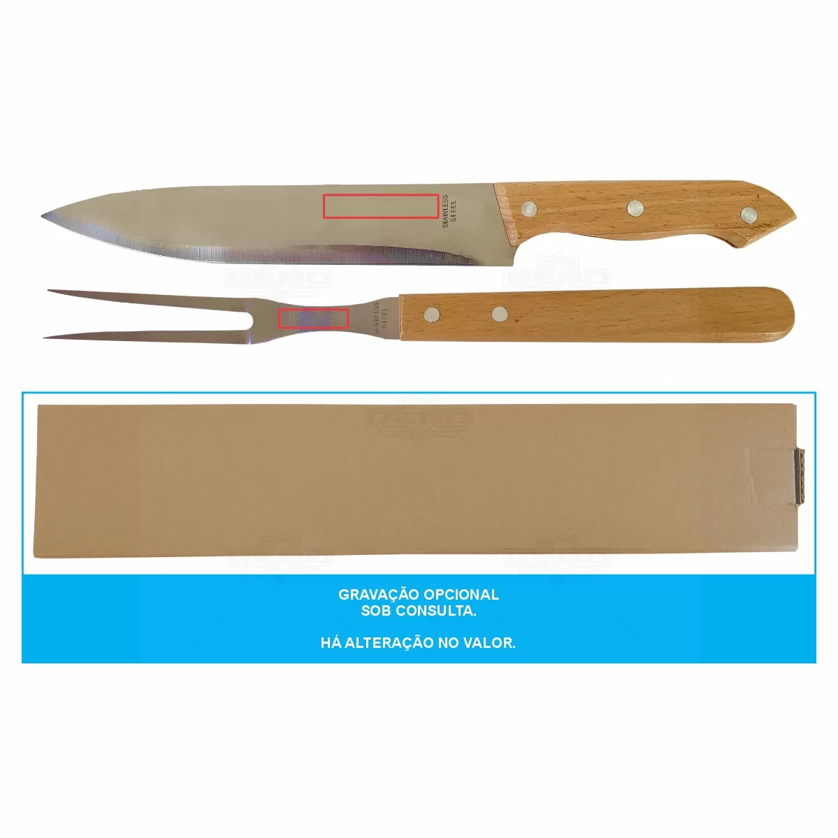 Kit churrasco com 2 peças personalizado produzido de madeira e metal. Possui 1 faca para cortes de carnes em geral com lâmina de aço e cabo de madeira 1 garfo inox trinchante. Acompanha estojo em cartonagem kraft. Ideal para brindes personalizados e eventos corporativos.