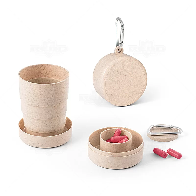 Copo retrátil personalizado, produzido em em fibra de bambu (50%) e PP (50%) com capacidade até 210 ml, possui compartimento para comprimidos e mosquetão que facilita o transporte. Obs: A principal função da tampa é servir como um compartimento e auxiliar no fechamento quando o produto está retraído, sendo assim não é recomendável a utilização quando o produto está estendido por não possuir ajuste compatível. Ideal para eventos corporativos, brindes promocionais e feiras gastronômicas.
