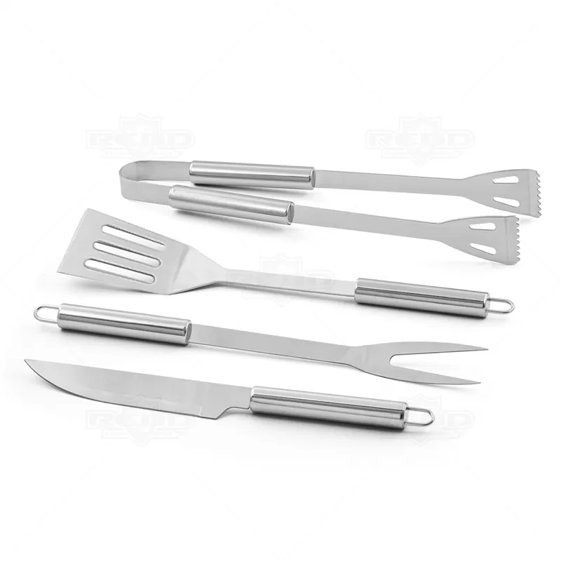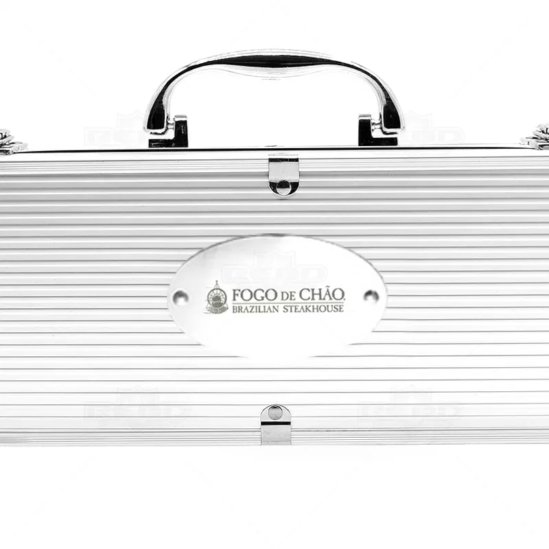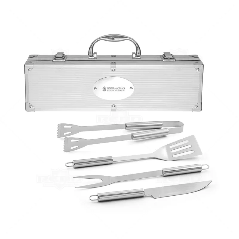 Kit churrasco 4 peças em maleta de alumínio com travas de segurança. Possui 1 espátula, 1 pegador, 1 garfo e 1 faca em inox. Parte interna da maleta com revestimento em Tnt e suportes de velcro para fixação das peças.