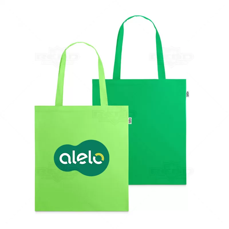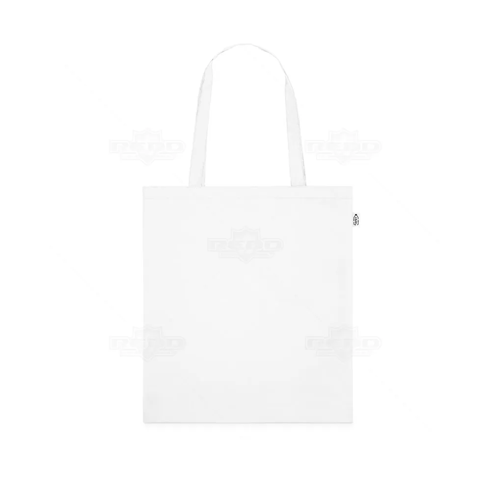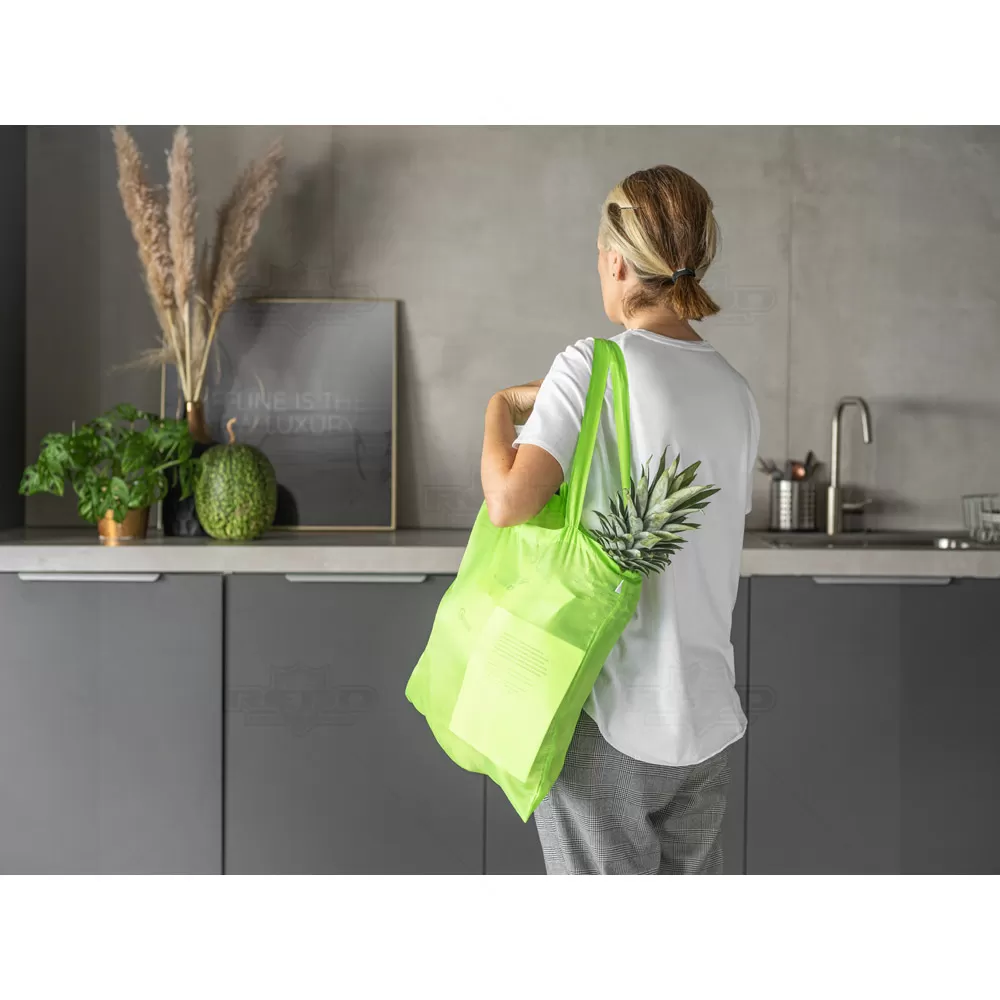 Sacola personalizada produzida em 100% rPET 190T plástico reciclado contribuindo para a redução dos resíduos no meio ambiente. Possui alças de 25cm e amplo espaço interno. Ideal para brindes promocionais e eventos corporativos. Imagem ilustrativa.