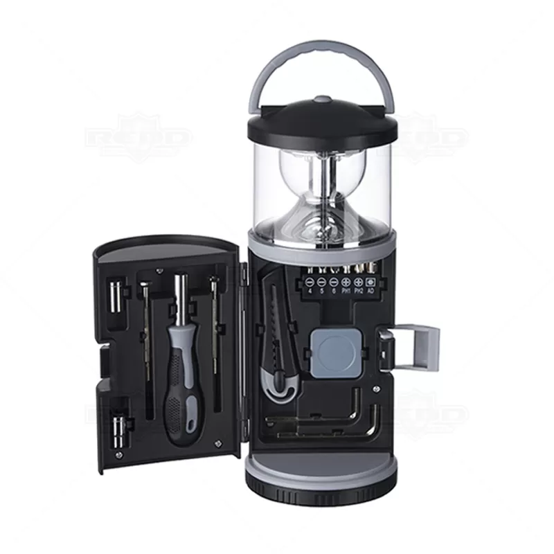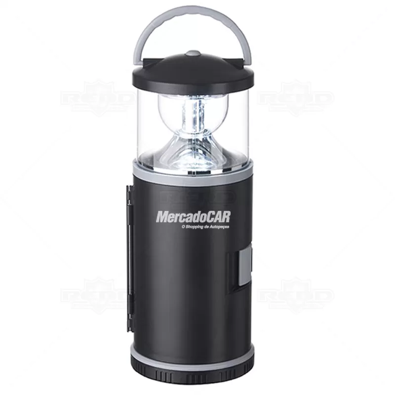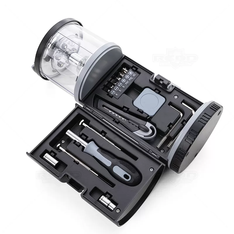 Lanterna personalizada com dois modos de iluminação sendo um em LED branco e o outro com luzes piscantes de emergência vermelha. Possui alça superior, botão liga e desliga, trava de fechamento lateral e 15 ferramentas: 1 Trena de 1 metro; 1 Estilete; 3 Pontas de chave de fenda; 2 Pontas de chave philips; 1 Cabo emborrachado para encaixar ponta de chave de fenda e philips; 1 Mini chave de fenda; 1 Mini chave philips; 2 Chaves hexagonal em L; 2 Soquetes de chave hexagonal e 1 Extensor para soquete de chave hexagonal. Fonte de energia: 3 pilhas AA Obs.: Acompanham 3 pilhas AA. Ideal para pequenos reparos, brindes promocionais e eventos corporativos.