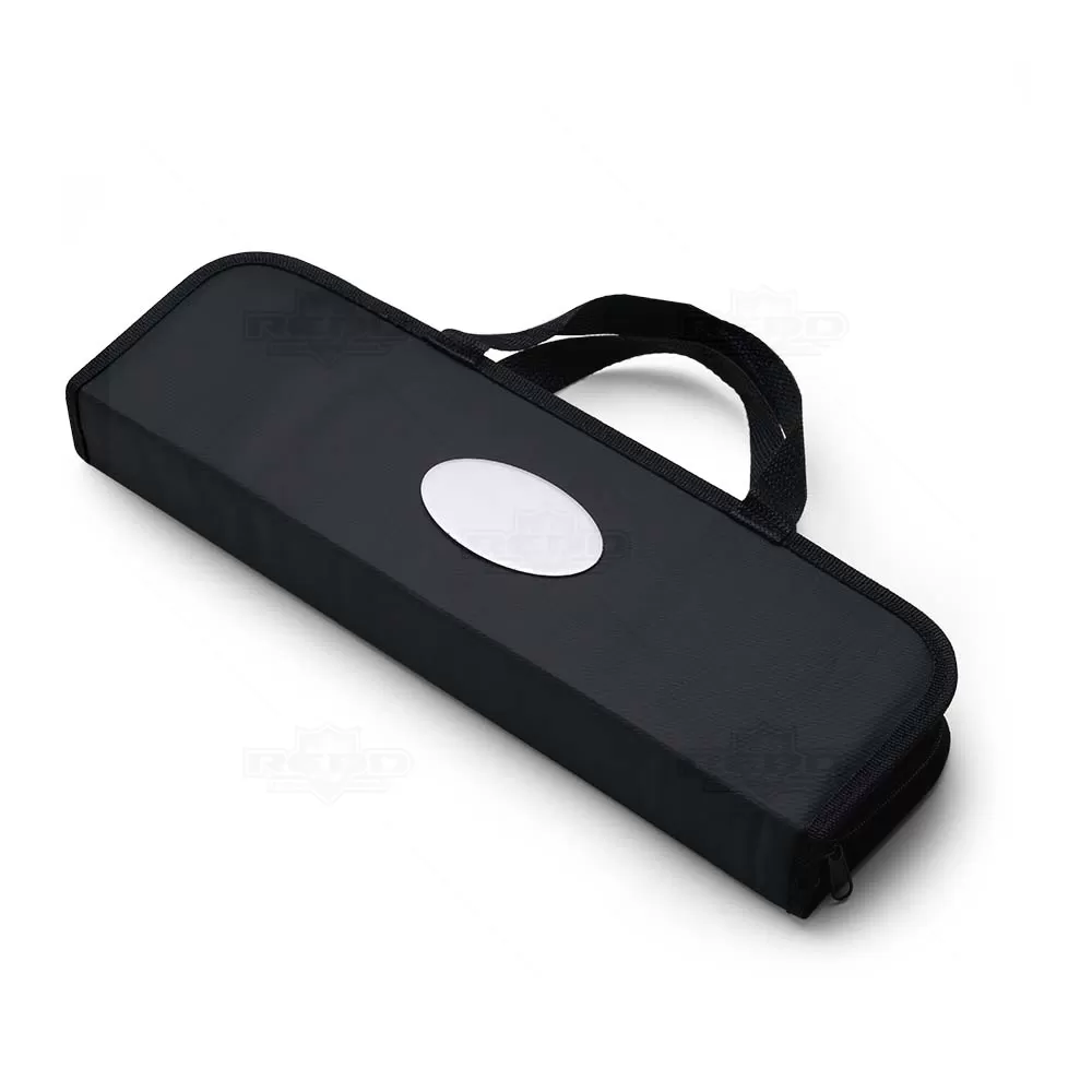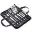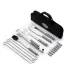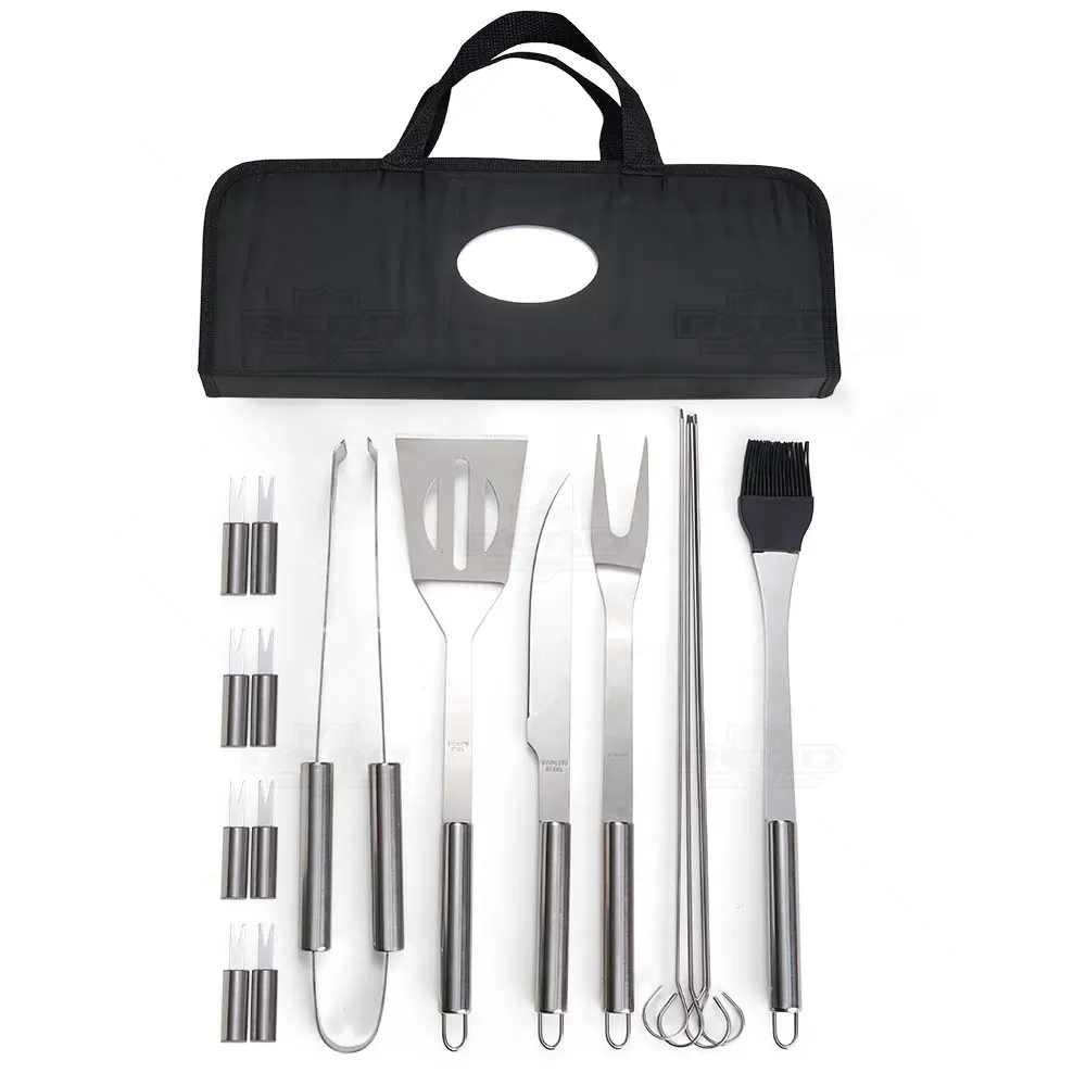 Kit Churrasco 17 Peças em estojo de nylon com alça. Contém: pegador, garfo, espátula, faca, pincel, 4 espetos e 8 garfos pequenos para petiscos. Utensílios de inox com proteções plásticas e parte interna com velcro para fixação das peças, acompanha plaquinha metálica para personalização. Ideal para brindes promocionais e eventos corporativos.