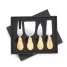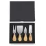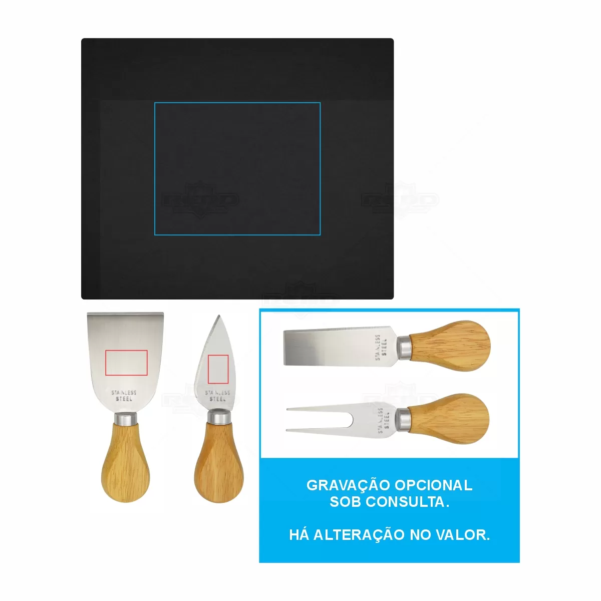 Kit queijo 4 peças em estojo de papelão com berço de espuma, contém: faca com ponta, faca reta, garfo e espátula. Ideal para brindes promocionais e eventos corporativos.