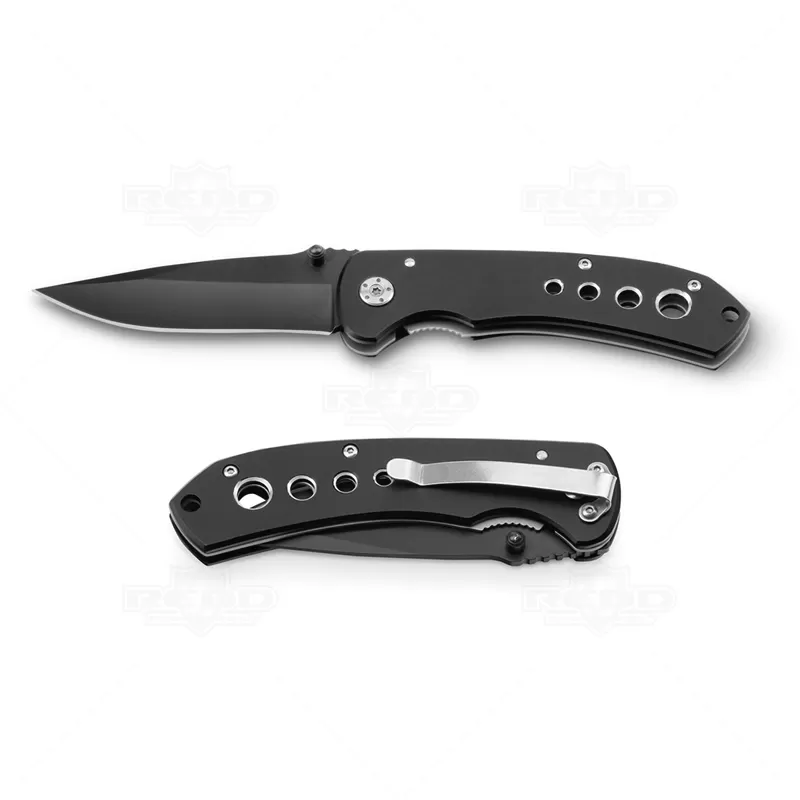 Canivete de metal personalizado produzido em aço inox com detalhes diferenciados. Possui fecho de segurança e clipe para bolso. Ideal para pesca, camping e esportes de aventura.