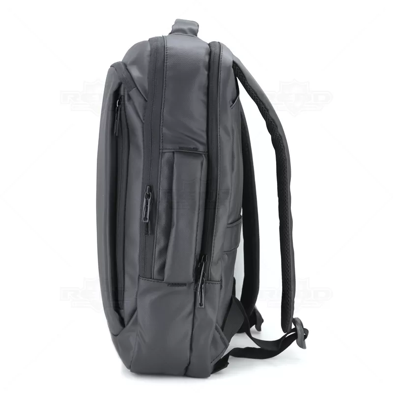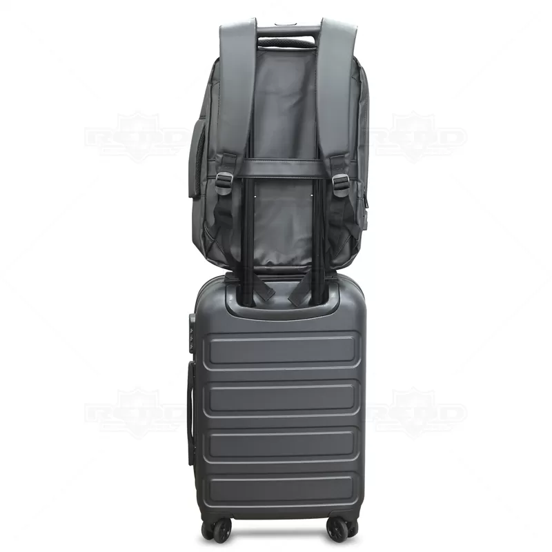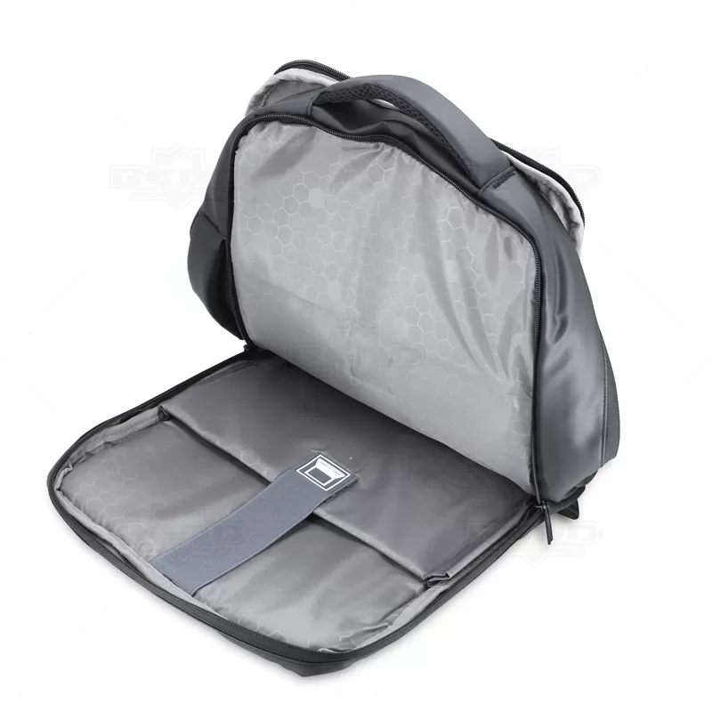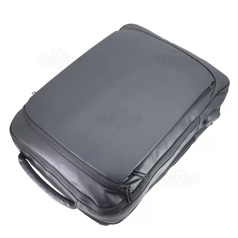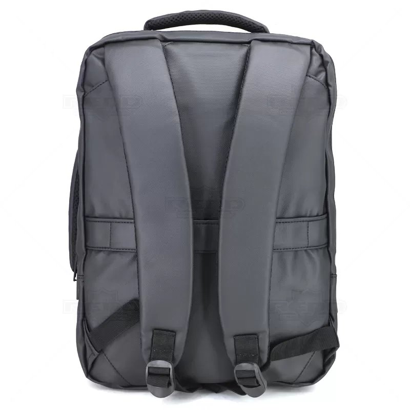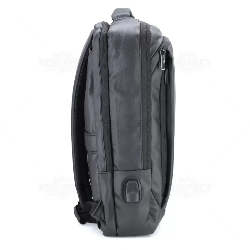 Mochila para notebook confeccionada em material sintético com compartimento para notebook até 15,6 polegadas. Contém Dois compartimentos grandes sendo um com divisórias para documentos, eletrônicos e caneta, e um com divisória para Notebook até 15,6 polegadas. Três compartimentos frontais, nos quais 2 possuem abertura vertical, e um abertura horizontal. Tecido Impermeável, compartimento traseiro para ocultação das alças de ombro. Bolso lateral e adaptador USB externo com cabo acoplado, permitindo a conexão de um carregador portátil de dentro da mochila e transferência da carga para o lado externo, ocultando o carregador e viabilizando a utilização do celular durante o processo. Contém zíperes com pegadores metálicos, alça de mão em nylon, alças para as costas ajustáveis com revestimento espumado antitranspirante, alça horizontal para encaixe em malas de viagem e alça lateral que possibilita que a mochila seja carregada como uma pasta. Imagem ilustrativa.