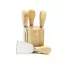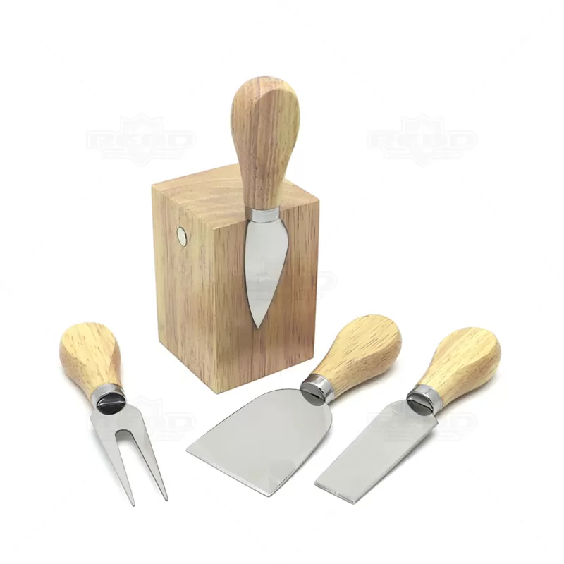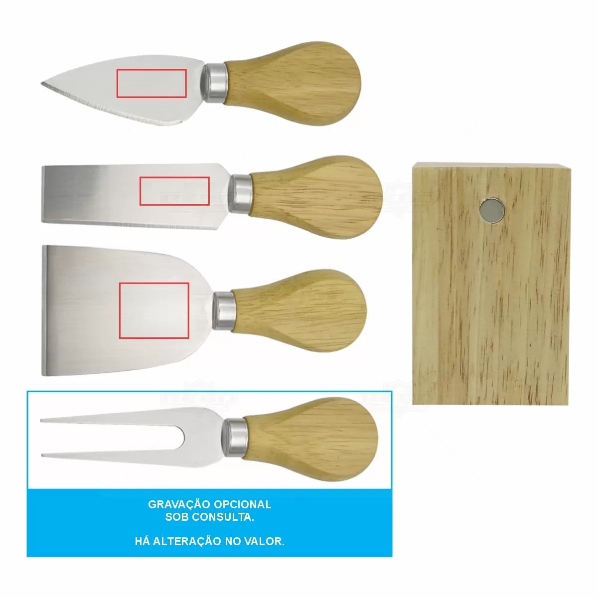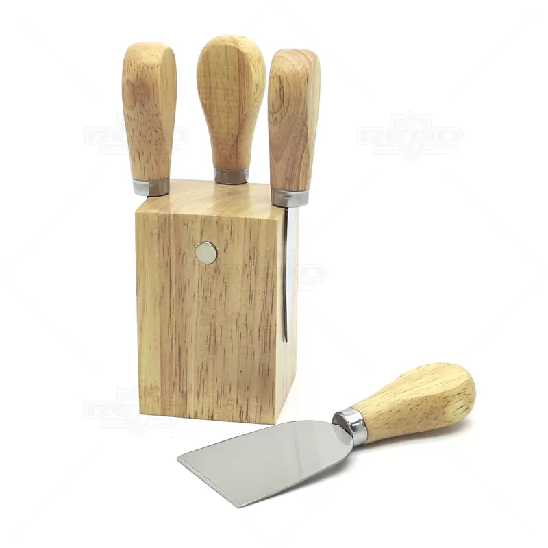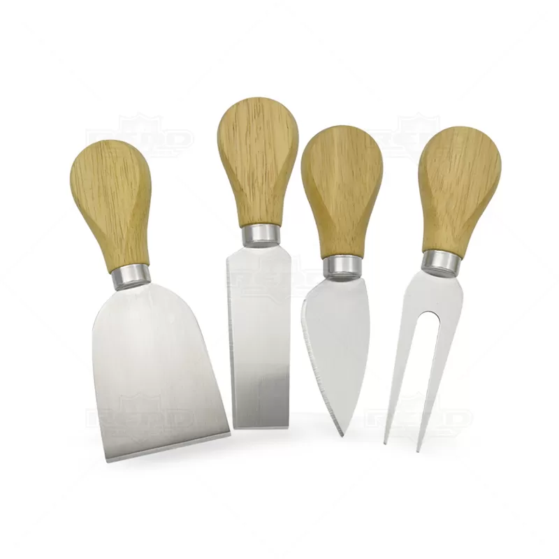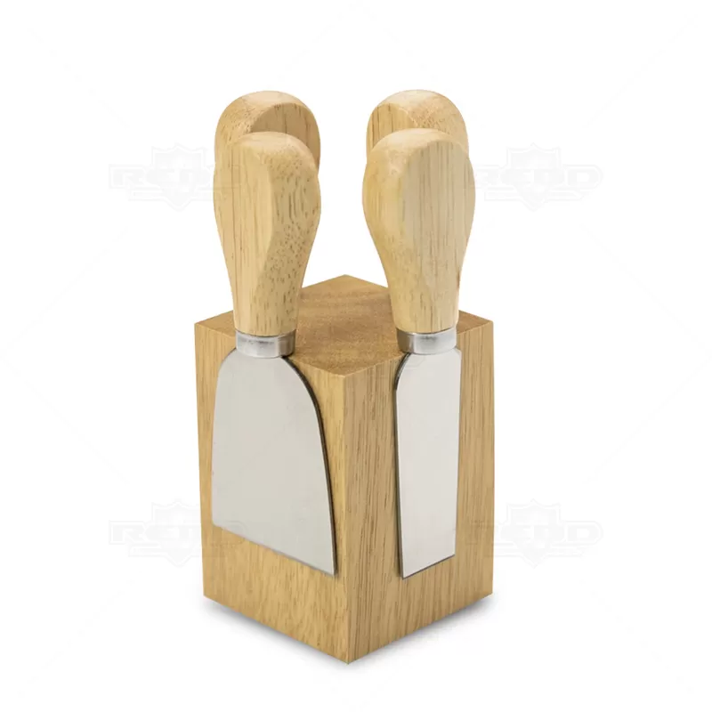 Kit queijo 4 peças personalizado possui suporte de madeira central para fixar as peças após o uso,1 Espátula, 1 faca de ponta reta, 1 faca de ponta, 1 garfo. Lâminas para cortes preciso de alta durabilidade. Ideal para brindes promocionais e eventos corporativos. Obs: Tamanho montado: 145 x 73 x 72 mm