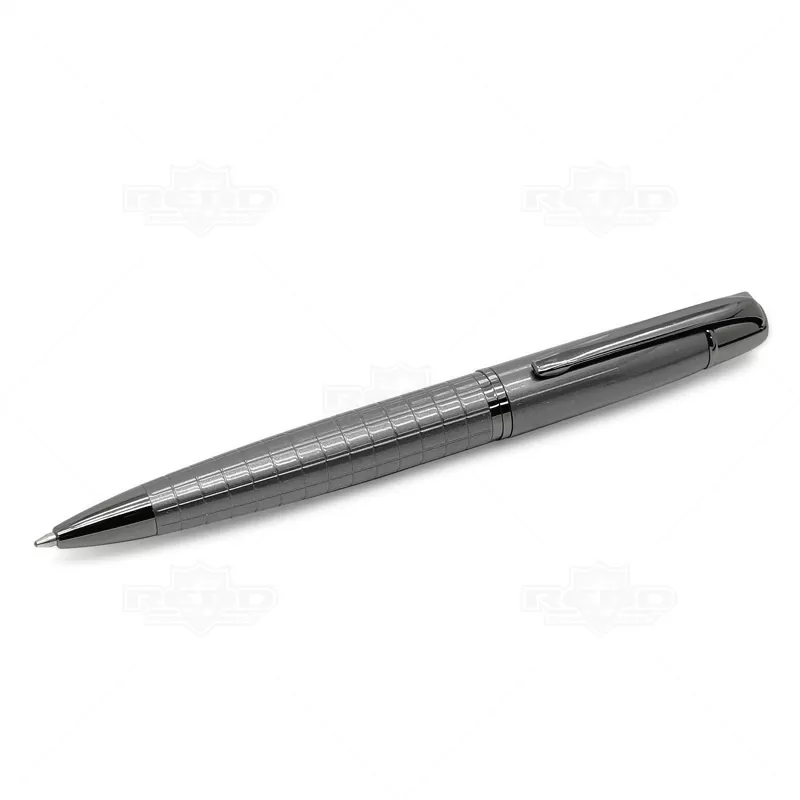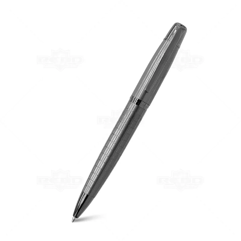 Caneta de metal personalizada com escrita macia e confortável. Possui clip de metal e detalhe diferenciado com toque elegante e luxuoso no corpo da caneta. Acionamento da escrita por giro (twist) e esferográfica em escrita azul. Ideal para brindes promocionais e eventos corporativos