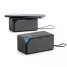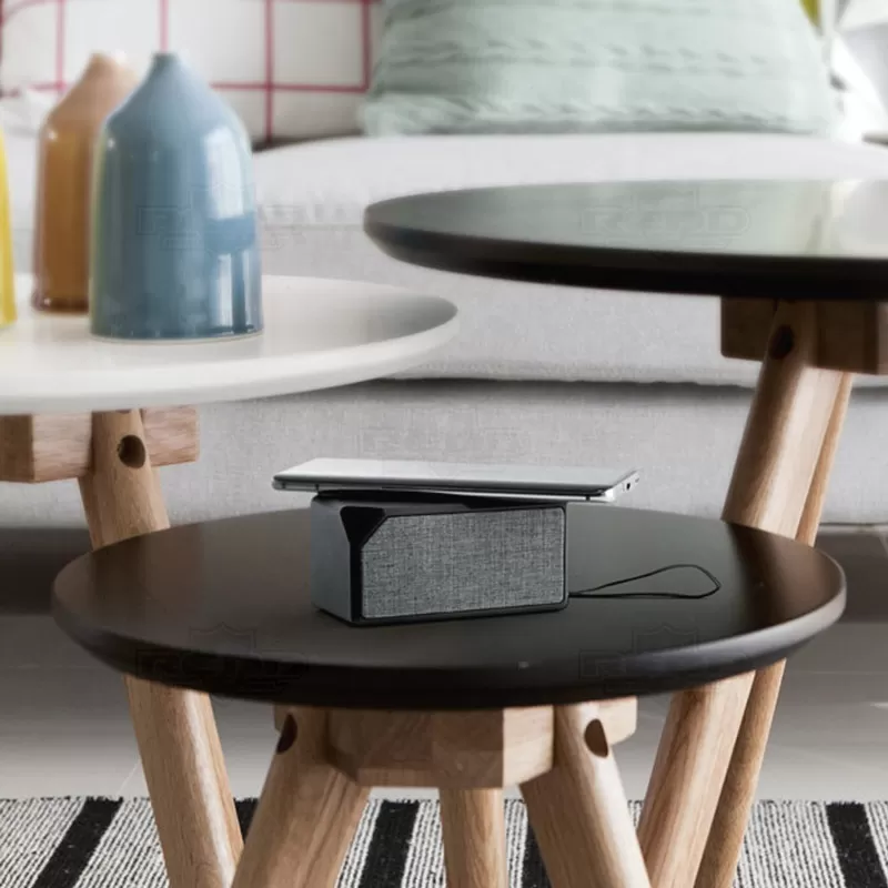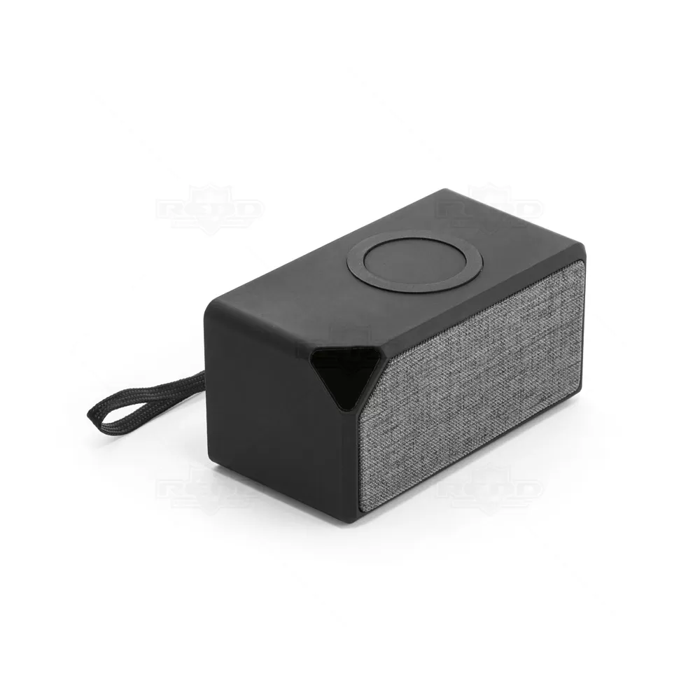 Caixa de som personalizada, produzida em ABS, com acabamento em borracha e tecido na parte frontal. Com design sofisticado, esta caixa de som tem um tempo de reprodução de aproximadamente 2 horas, com transmissão Bluetooth 5.0 e potência de 3W. Conta ainda com a funcionalidade de carregador wireless, com uma potência de 5 W, com entrada 5V/2A e bateria de 300 mAh. Incluso cabo de carregamento micro USB. Ideal para brindes promocionais e eventos corporativos. Imagem ilustrativa, itens decorativos não acompanham o produto.