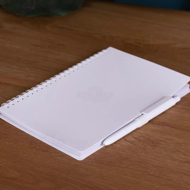 Bloco de anotações personalizado produzido em material antibacteriano com capa em PP (polipropileno) e com encadernação wire-o. Acompanha 1 caneta plástica retrátil , miolo com aproximadamente 70 folhas brancas pautadas e elástico porta caneta lateral. Ideal para brindes promocionais e eventos corporativos. Imagem ilustrativa.