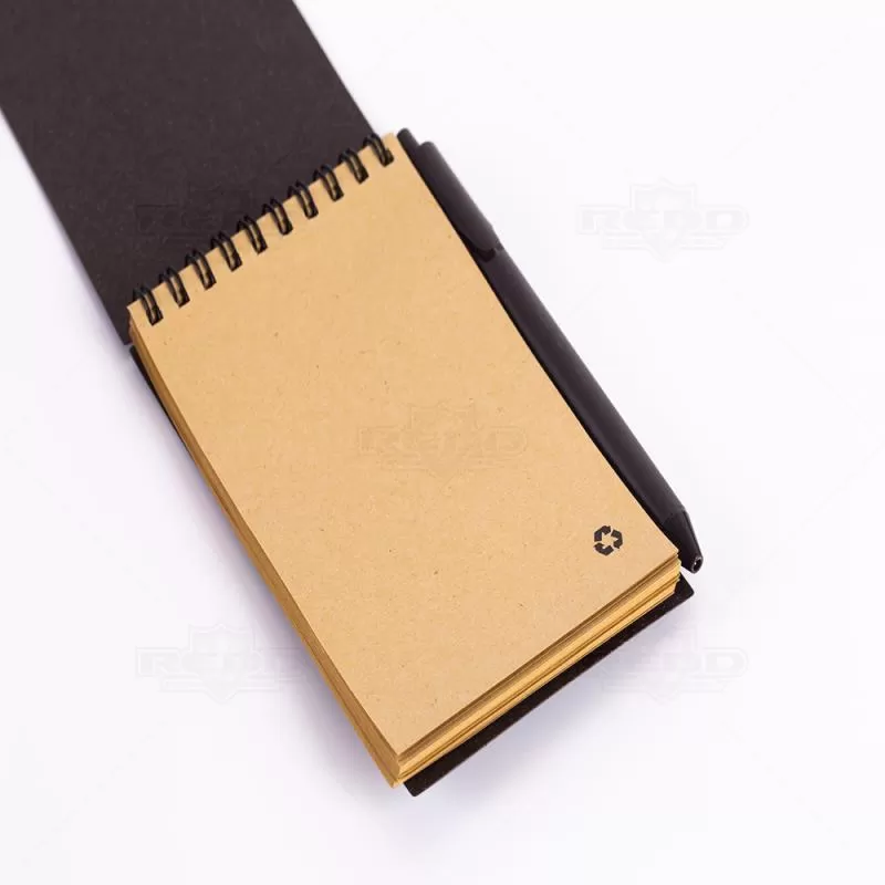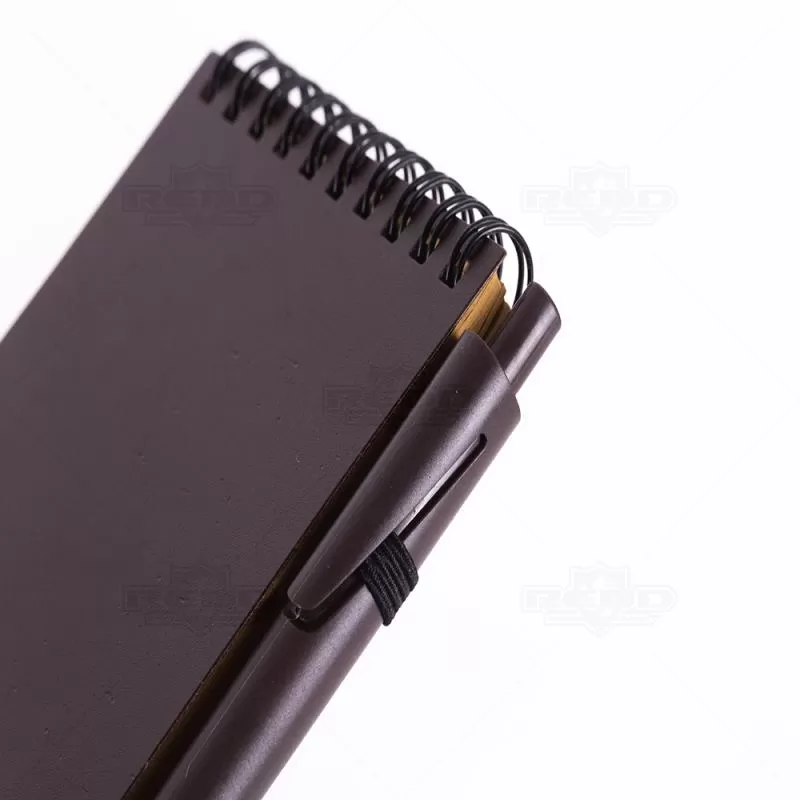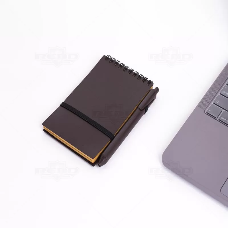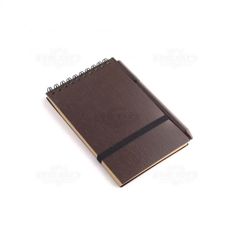 Bloco de anotações personalizado produzido em material antibacteriano com capa em PP (polipropileno) na cor café, encadernação wire-o. Acompanha caneta plástica retrátil também na cor café, miolo com aproximadamente 70 folhas sem pautas e elástico para fechamento da capa. Ideal para brindes promocionais e eventos corporativos.