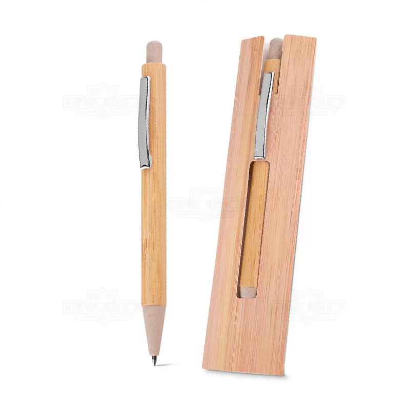 Caneta ecológica personalizada produzida em bambu com click e ponteira de fibra de trigo / ABS. Possui esferográfica azul e acionamento da escrita por click. Produto inovador visando campanhas que defendem um mundo mais sustentável. Ideal para divulgar sua empresa em eventos corporativos, brindes personalizados e campanhas promocionais. Acompanha estojo de papel impresso com imitação em bambu.