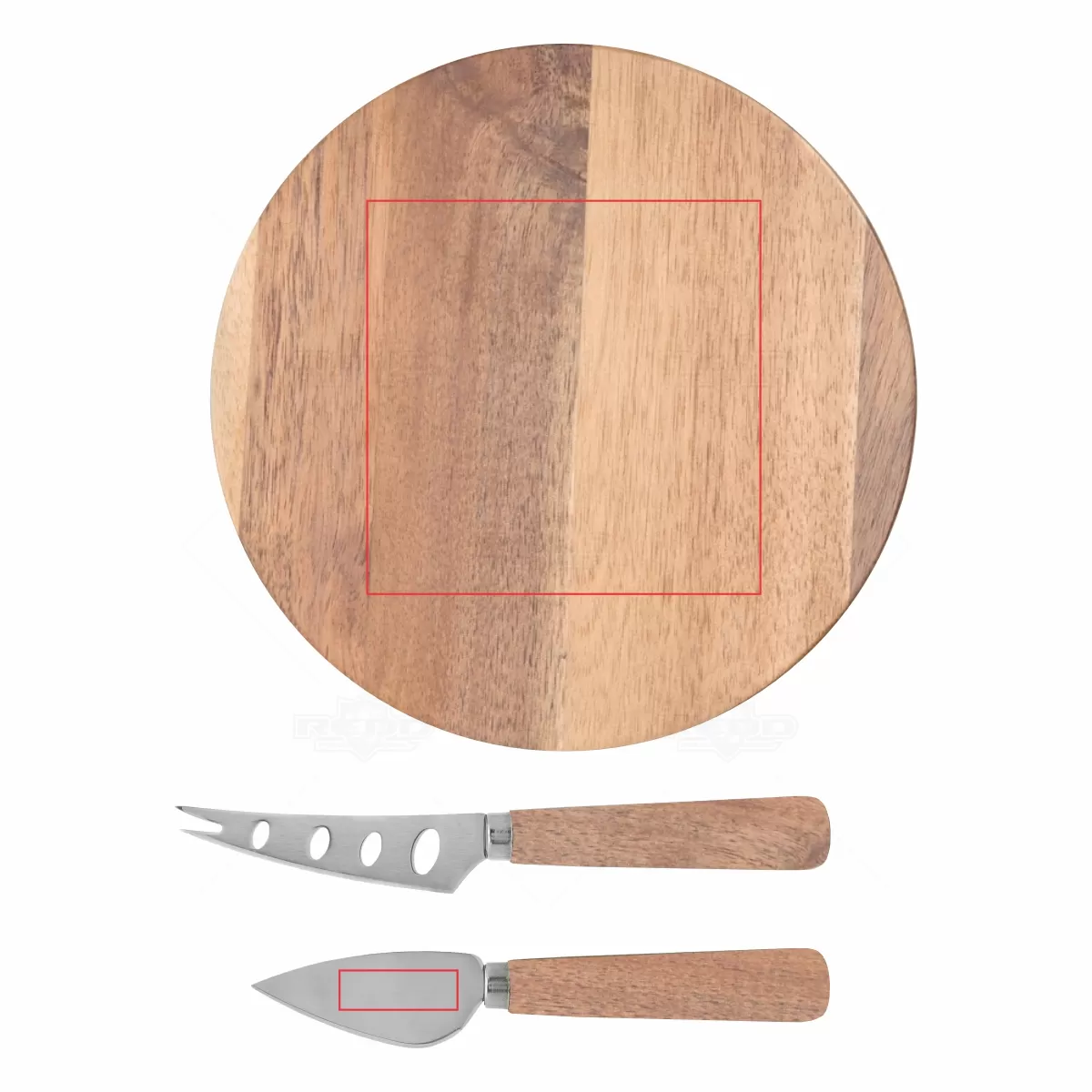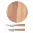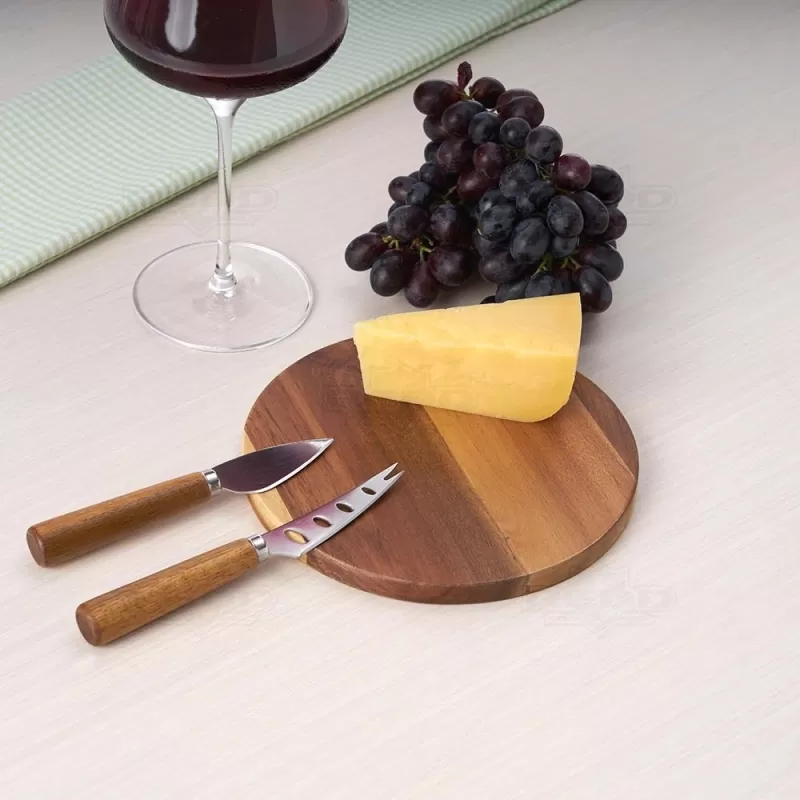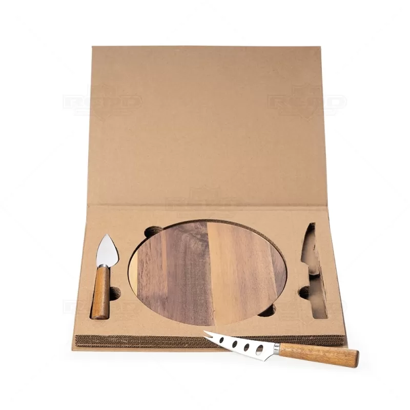 Kit queijo 3 peças em estojo kraft, contém: tábua de madeira redonda, faca com ponta, e faca vazada com ponta. Tábua com orifício para encaixe. Ideal para brindes promocionais e eventos corporativos. Imagem ilustrativa.