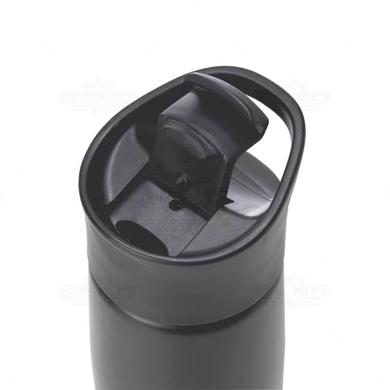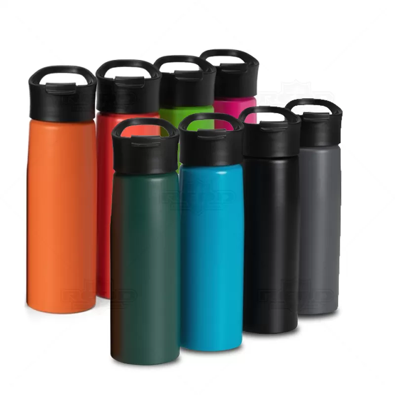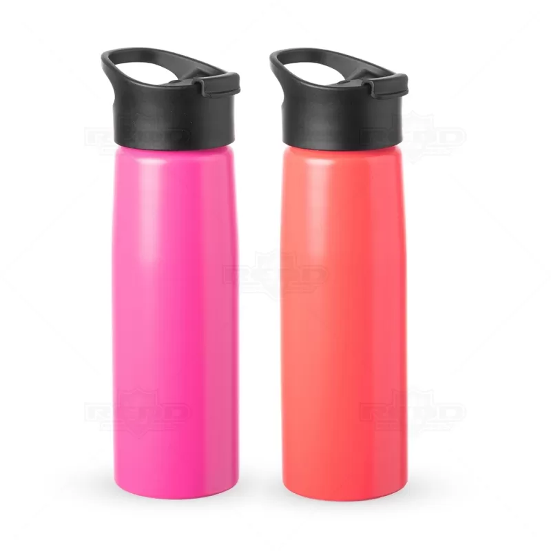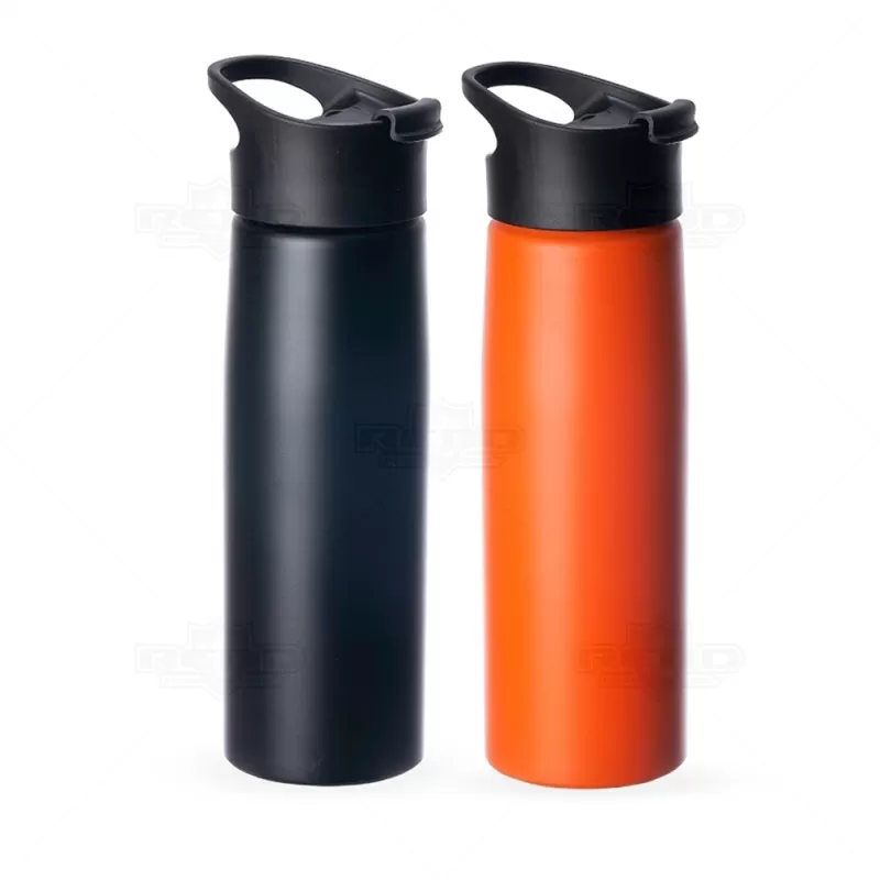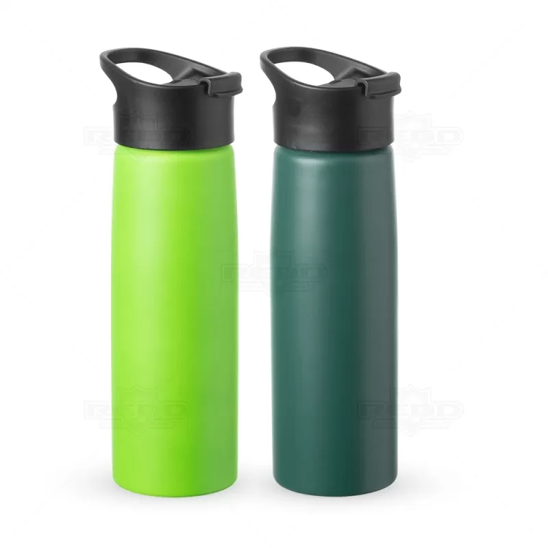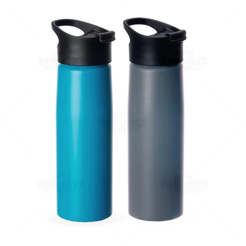 Squeeze de alumínio com capacidade para até 750ml, com pintura fosca, tampa plástica rosqueável, alça e tampa protetora para o bocal atóxico. Ideal para brindes promocionais e eventos corporativos.