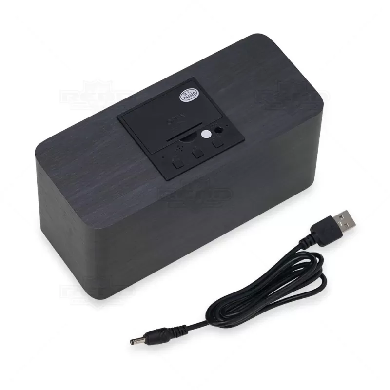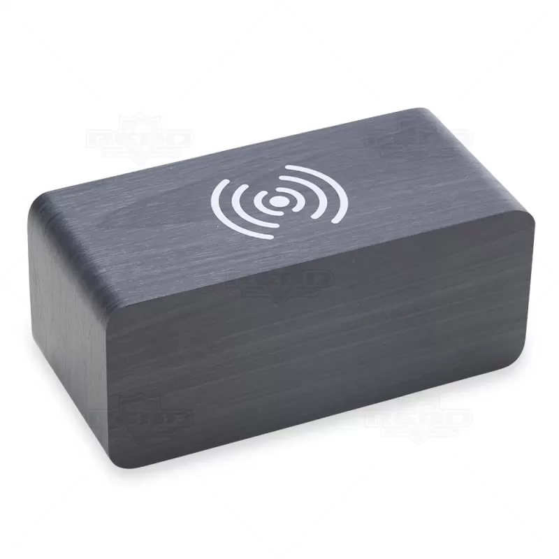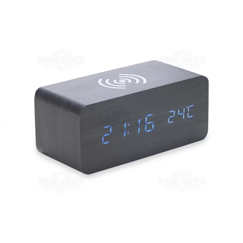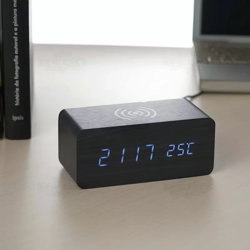Relógio de mesa digital LED com alarme e carregamento por indução, pode ser utilizado através da fonte USB (acompanha) ou 3 pilhas AAA (não acompanha). Produzido em MDF com textura similar a madeira, o relógio possui um display LED na parte frontal, área para carregamento via indução na parte superior, parte traseira com mecanismo para ajustes, entrada DC 5V e compartimento de pilhas. Ideal para brindes promocionais e eventos corporativos. Imagem ilustrativa.