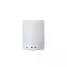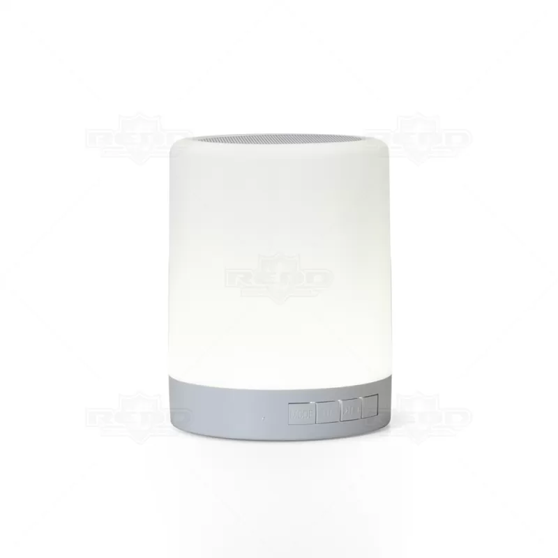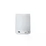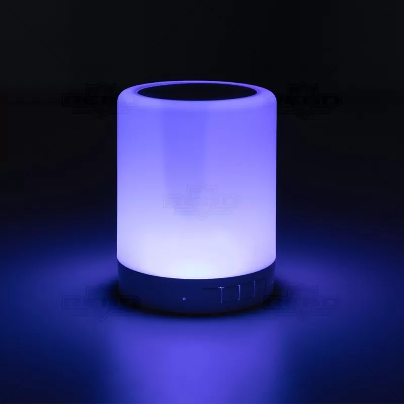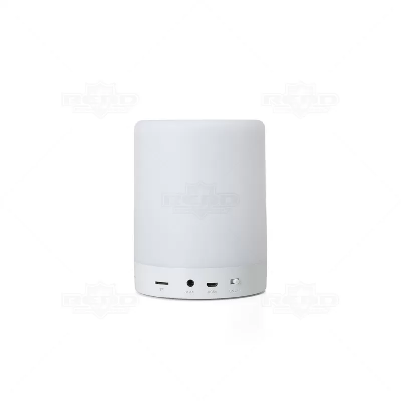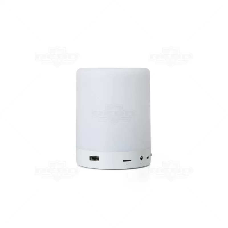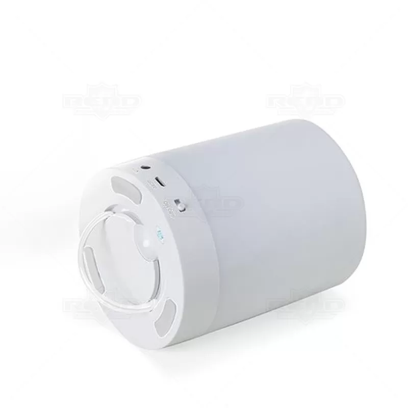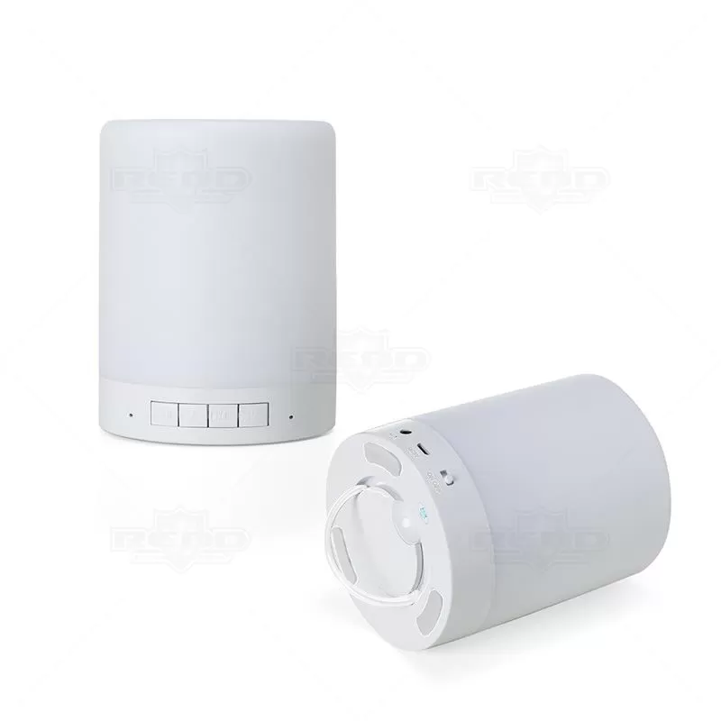 Caixa de som personalizada, produzida em material plástico resistente, na cor branca fosca, parte superior com falante e sensor touch para troca de luzes (RGB) a parte inferior, branca leitosa, botão liga/desliga, entrada para o cartão, alimentação de energia e alça transporte. A caixinha executa nos modos Bluetooth, rádio FM, auxiliar e cartão TF (MicroSD). Acompanha cabo USB e cabo Auxiliar (P2). Ideal para brindes promocionais e eventos corporativos. Imagem ilustrativa, objetos decorativos não acompanham o produto.
