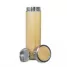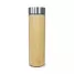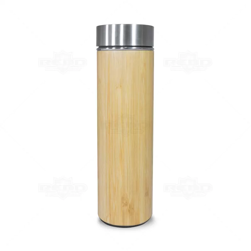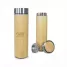Garrafa térmica personalizada com parte externa revestida em bambu e parte interna em inox com capacidade para 500ml. Possui parede dupla e infusor de metal ideal para conservar temperatura quente ou fria. Ideal para brindes promocionais e eventos corporativos.